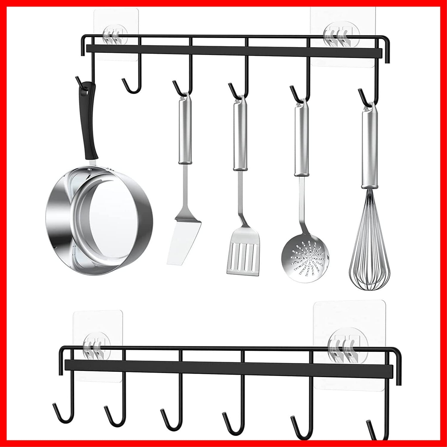DOIOWN キッチンツールフック 強力粘着式 穴あけ不要 壁掛けフック ステンレス製 キッチン収納 防水仕様 6フック付属 幅32cm 2個セット(補助テープ4枚付き)