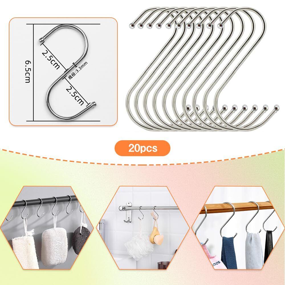 ステンレス製S字フックの長さは6.5cmで、様々な吊り下げニーズに対応する20個入りです。