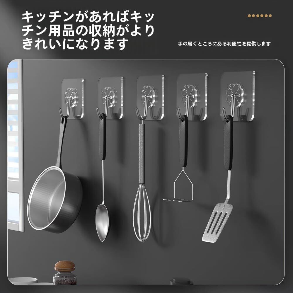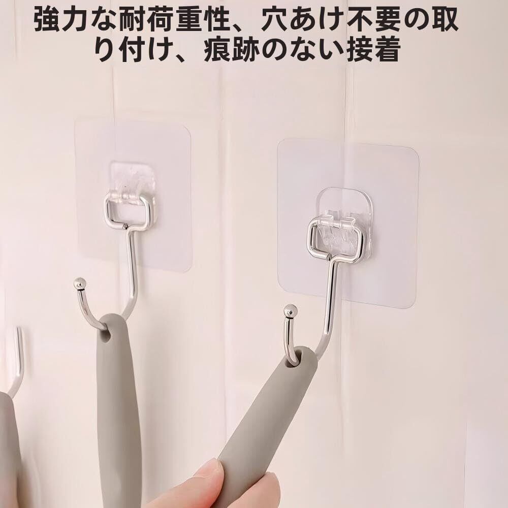 「この『フック粘着壁貼付跡なし壁フック』で、あなたのキッチンやバスルームをすっきりと整理整頓しませんか!」/特徴:跡が残らない特殊な粘着剤を使用したこのフックは、簡単に取り付け可能。壁を傷めることなく、穴あけや接着剤も不要で、さまざまな壁面にしっかりと固定できます。高品質素材で、防水性もあり、湿気の多い場所でも安心してご使用いただけます。