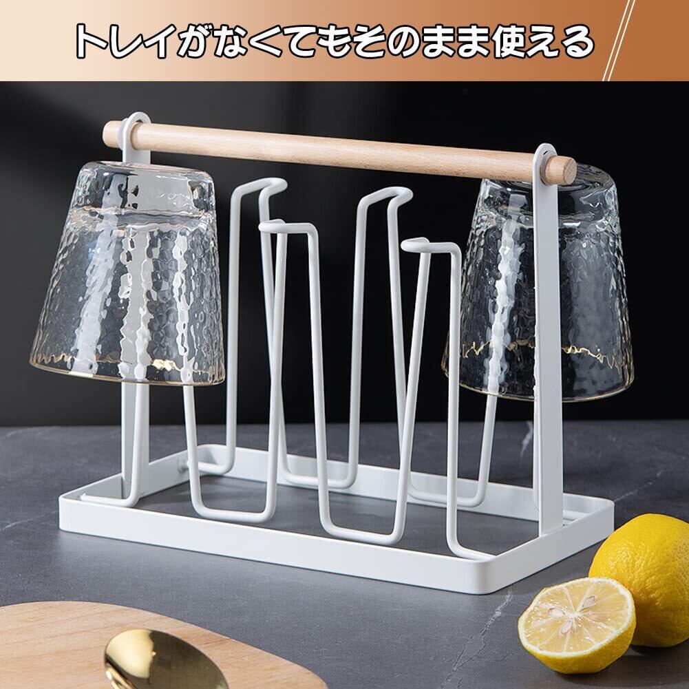 yazi グラススタンド コップホルダー 6個掛け ガラスホルダー 木製ハンドル付 北欧風 おしゃれでスリム キッチンツールスタンド ガラス収納乾燥 水切りラック シリコン滑り止め付 コップ立て (白・プラスチックトレイ)