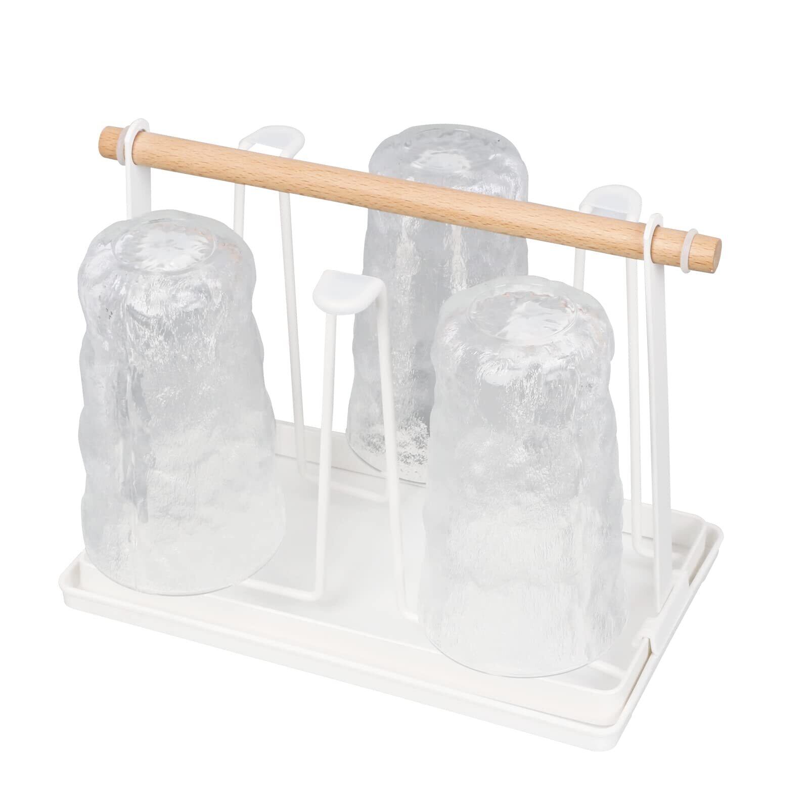 【在庫セール】yazi グラススタンド コップホルダー 6個掛け ガラスホルダー 木製ハンドル付 北欧風 おしゃれでスリム キッチンツールスタンド ガラス収納乾燥 水切りラック シリコン滑り止め付 コップ立て (白・プラスチックトレイ) | Cherry Blossoms