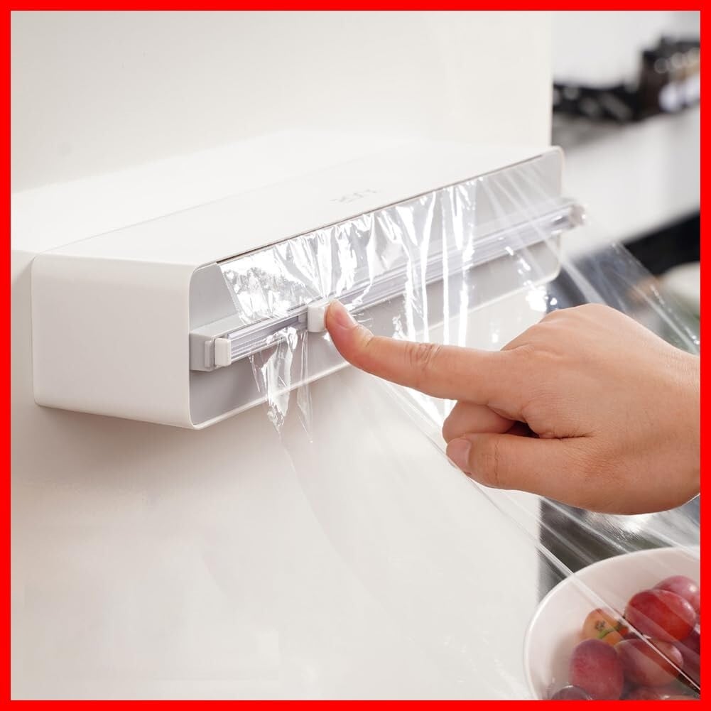 「この『ラップカット棚』で、毎日のキッチン作業をもっとスムーズにしてみませんか!」/特徴:シックなグレーのデザインが施されたこのラップカッターは、便利なスライド機能を搭載しており、食品ラップやアルミホイルを簡単に使いやすくします。冷蔵庫に吸附できるため、収納スペースの有効活用にも貢献します。