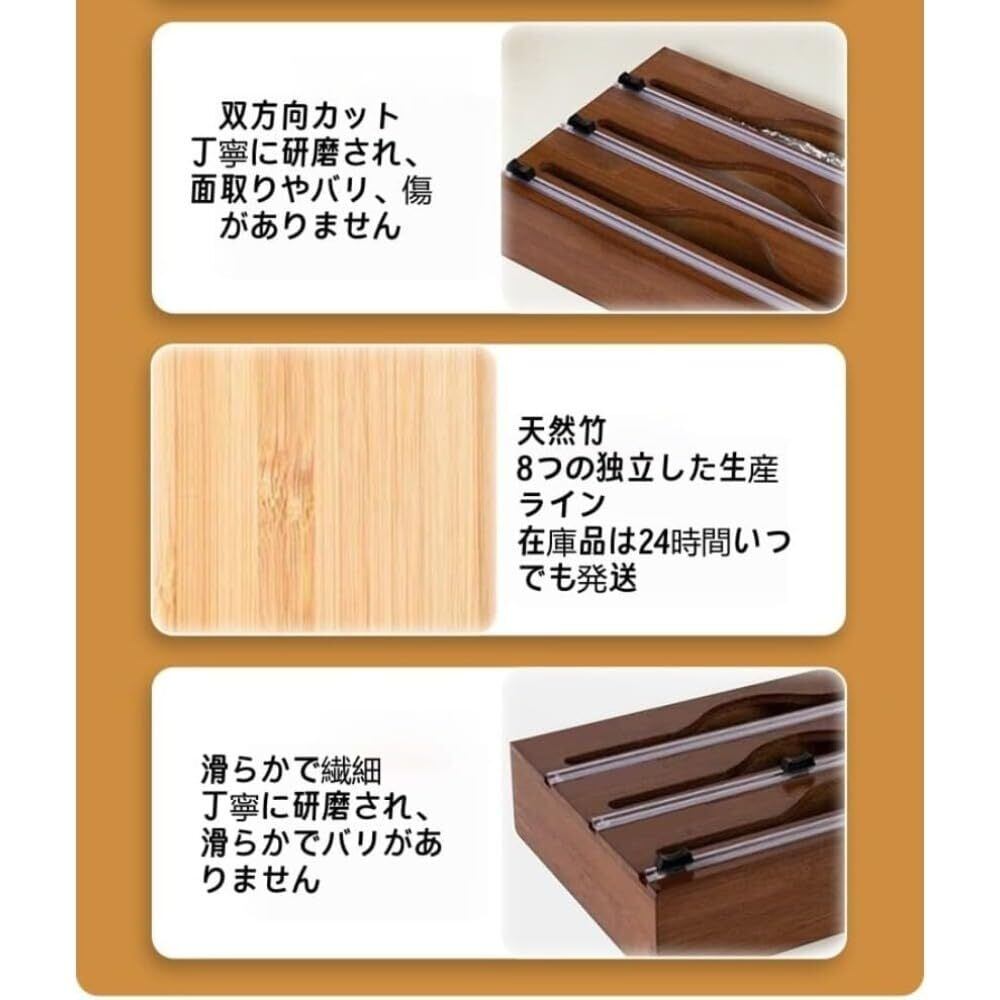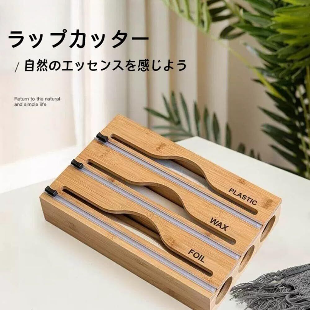 「この『aelah ラップカッター』で、キッチン作業をさらに快適にしてみませんか!」/特徴:自然な色合いのこのラップカッターは、スライド機能を備えており、食品用ラップやアルミホイルを簡単に切ることができる優れたデザインです。再利用可能な構造は、環境に優しく、長期にわたり使用できる点が魅力です。