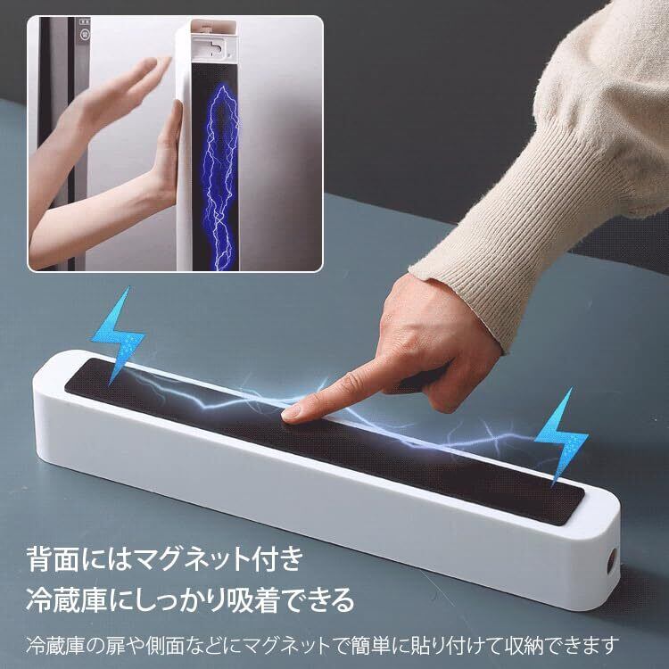 底部には強力なマグネットが付いており、冷蔵庫や壁にしっかりと取り付けることができます。設置場所を選ばずに使用でき、キッチン全体をすっきり整理できるのが魅力です。