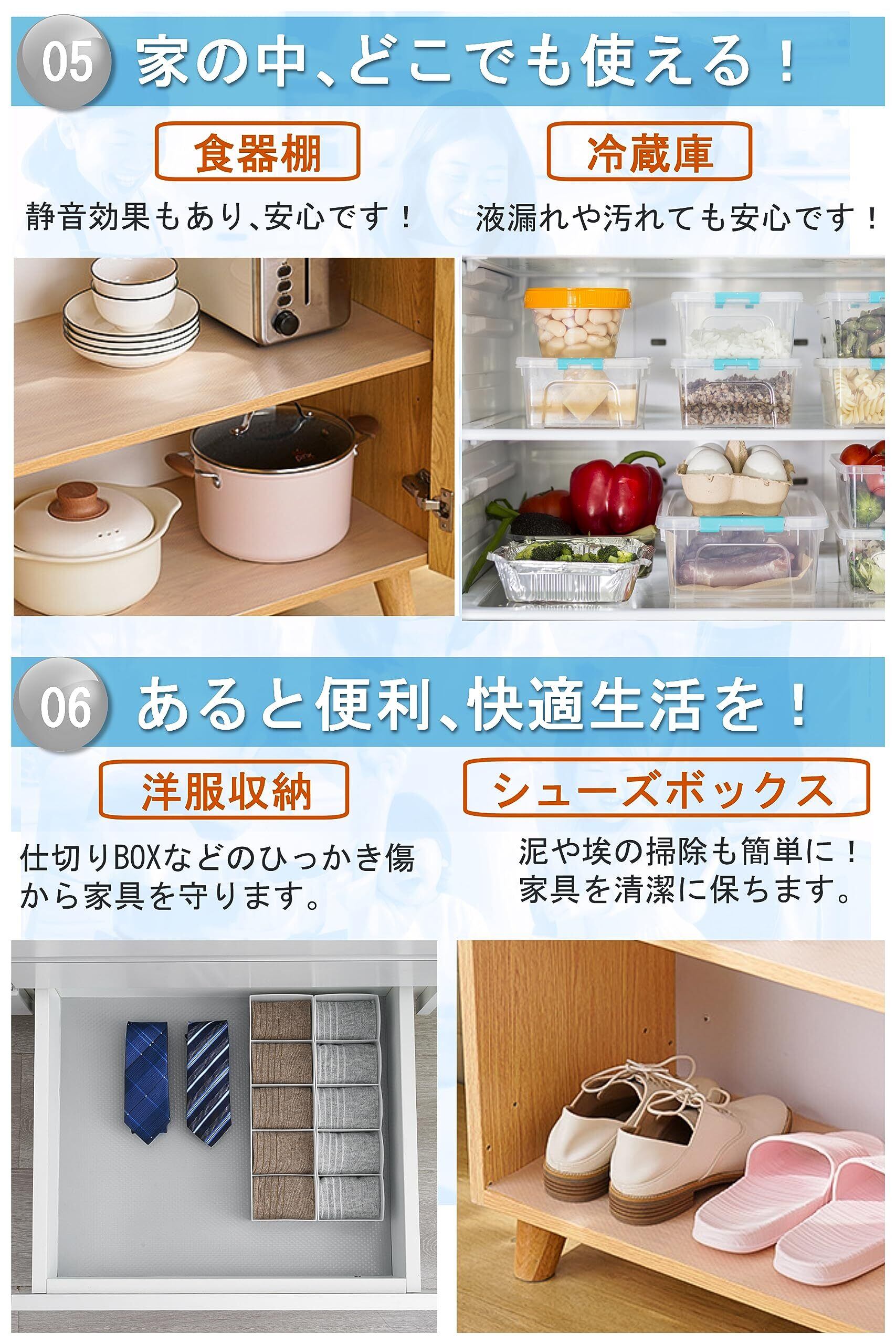 キッチンやシンク周り、冷蔵庫の中、食器棚、シューズボックス、洋服棚、収納ボックスなどにご利用できます。