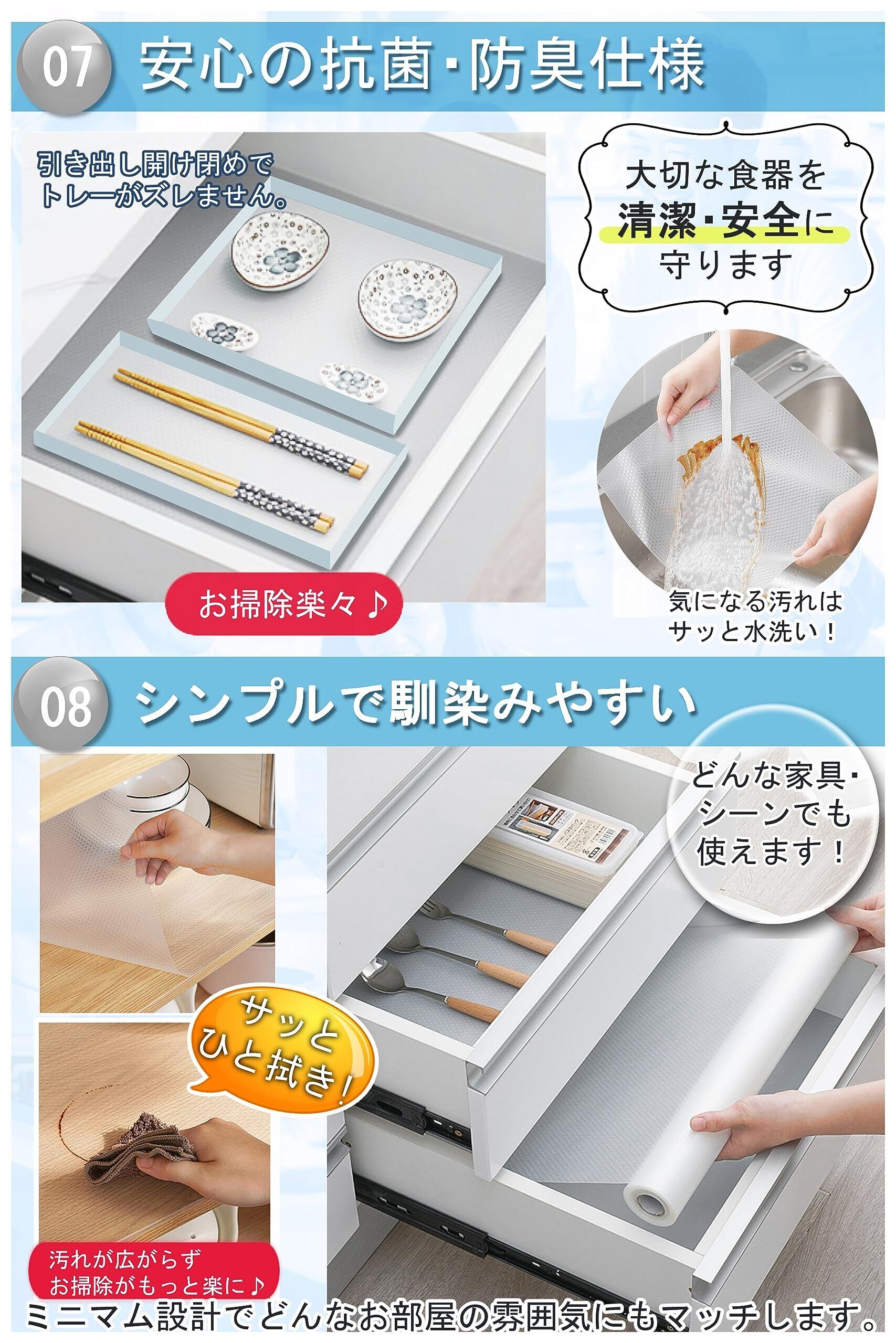 「この『食器棚シート』で、あなたのキッチンや収納スペースを一新してみませんか!」/特徴:幅30cm、長さ100cmのこの万能シートは、食器棚や引き出し、冷蔵庫、靴棚などさまざまな場所で活躍します。傷や汚れを防ぎ、常に清潔な状態を保つことができます。