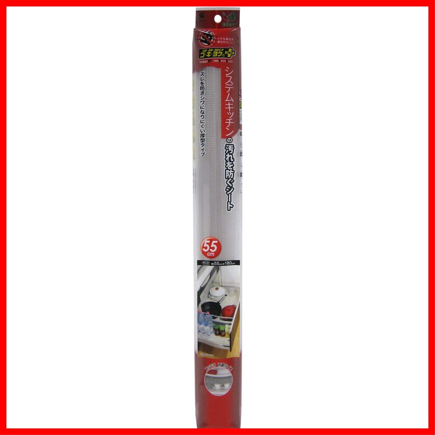「この『ワイズ 防虫シート』で、あなたのキッチンをより快適で清潔に保ちましょう!」/特徴:幅55cm、長さ180cmのこのシートは、キッチンや食器棚、引き出しなどで活躍します。天然成分を使用した無臭のタイプで、安心してご利用いただけます。