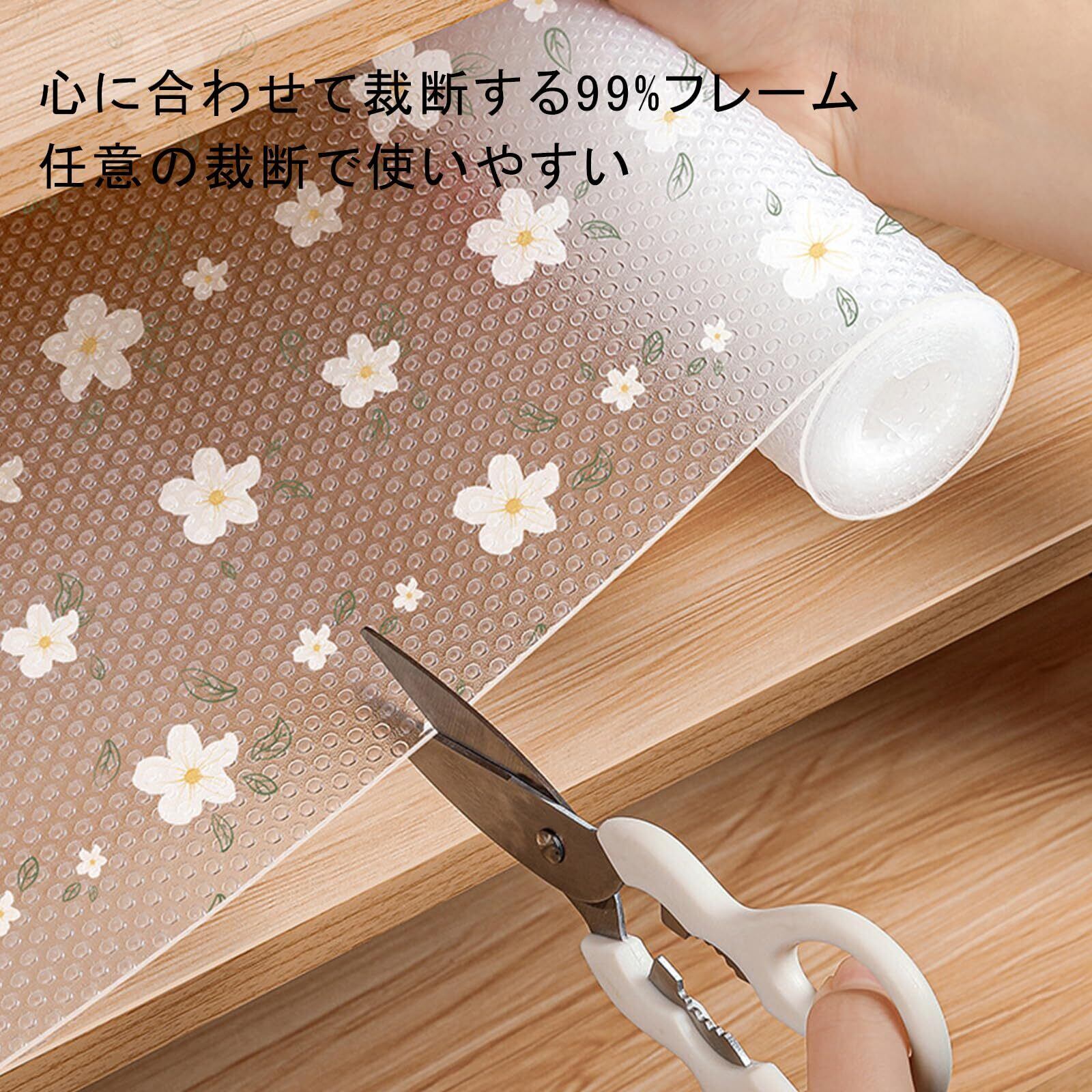 このシートはハサミで簡単にカットできるため、棚や引き出しに合わせたサイズに調整できます。キッチンや冷蔵庫など、多様な場所で手軽にご利用いただけます。