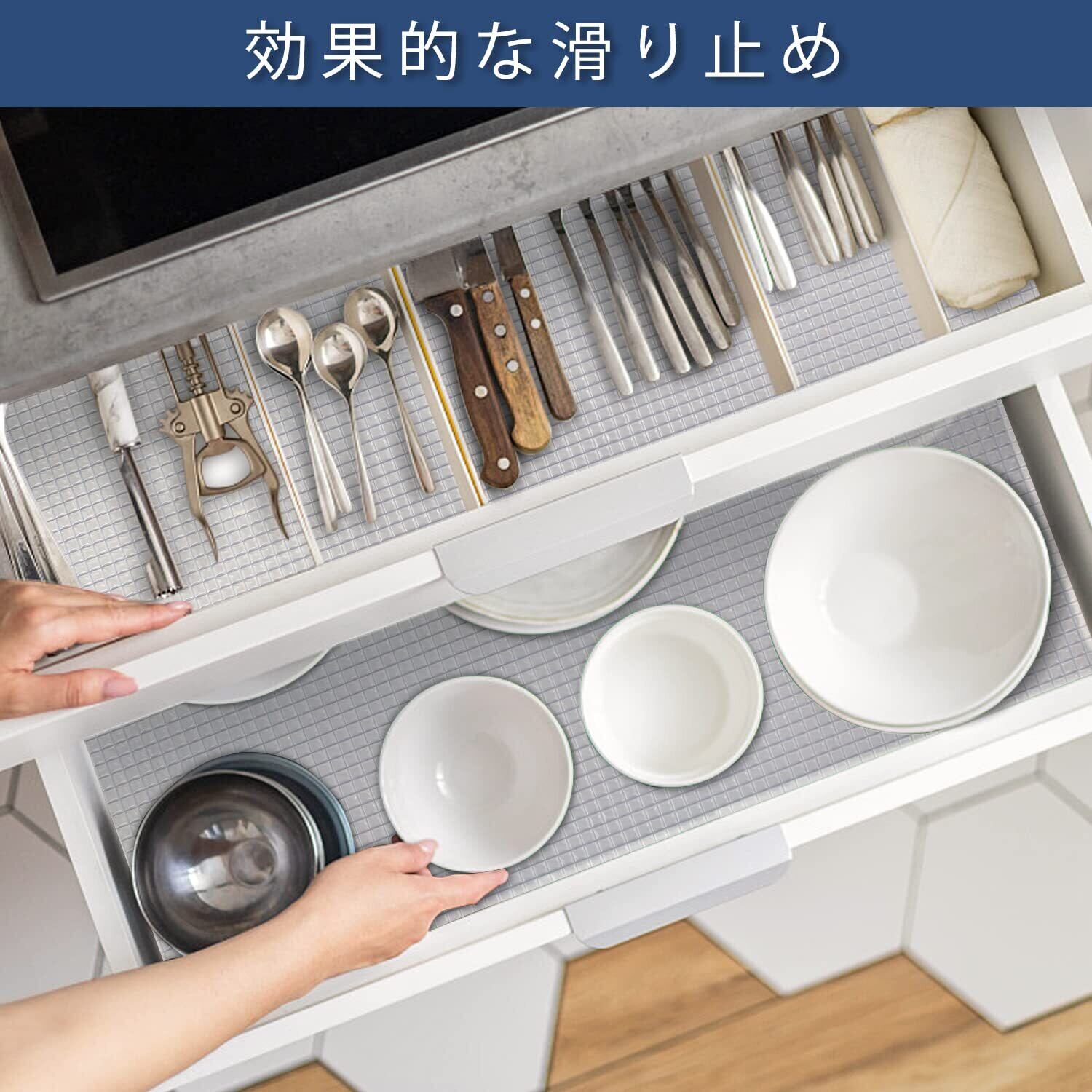 このシートはハサミで簡単にカットできるため、棚や引き出しに合わせたサイズに調整できます。キッチンやキャビネットなど、様々な場所で手軽にご利用いただけます。