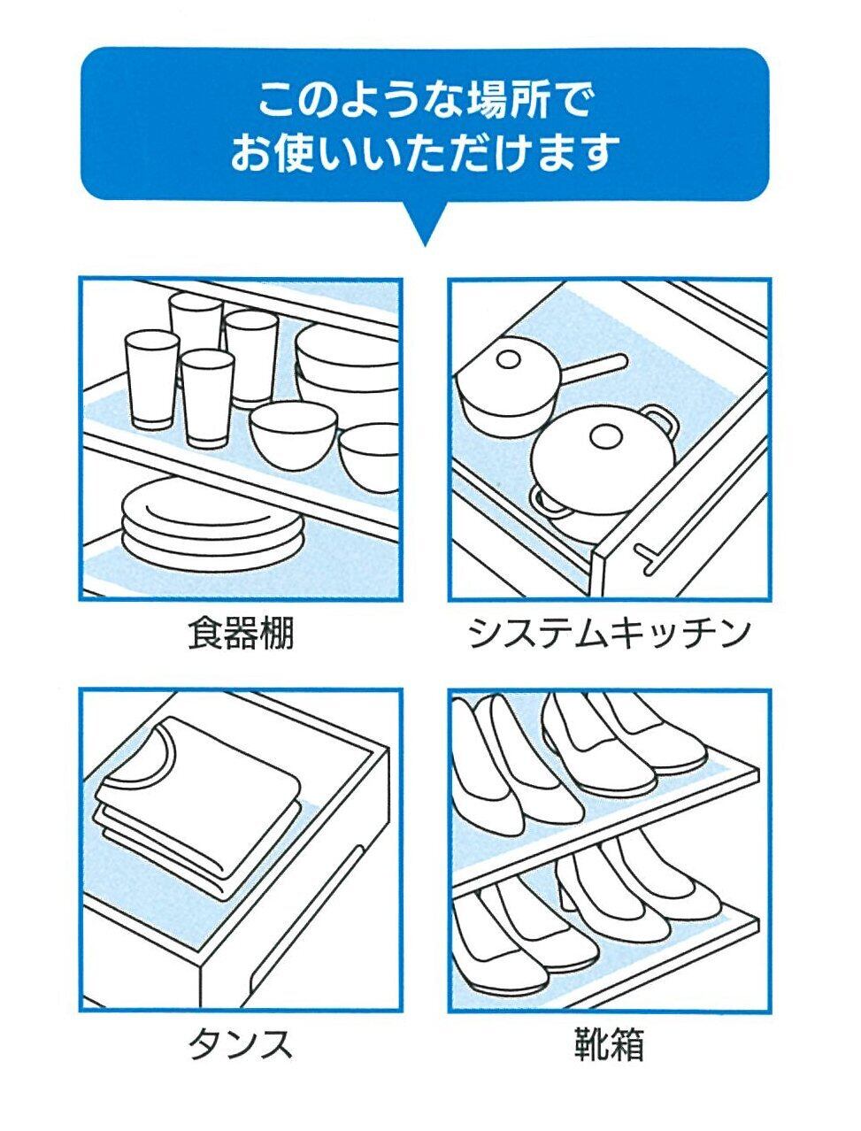 シートの裏面には滑りにくい素材が使用されており、設置後もしっかりと固定されます。食器や調味料の出し入れの際でもズレずに安心です。