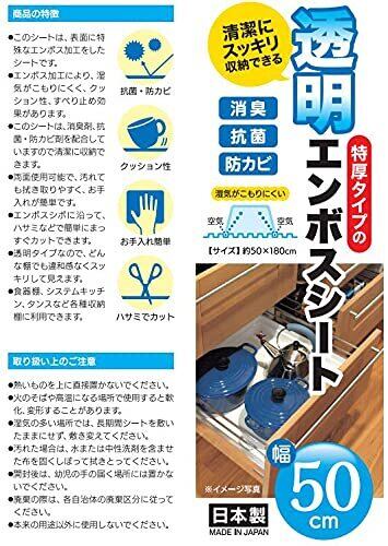 「この『日泉ポリテック 食器棚シート』で、あなたの収納スペースを清潔かつ安心に保ちましょう!」/特徴:幅50cm×長さ180cmのスペシャルサイズで、食器棚や引き出しにぴったりフィットします。透明エンボス加工により、優れた消臭・抗菌・防カビ機能を備えており、安心してお使いいただけます。