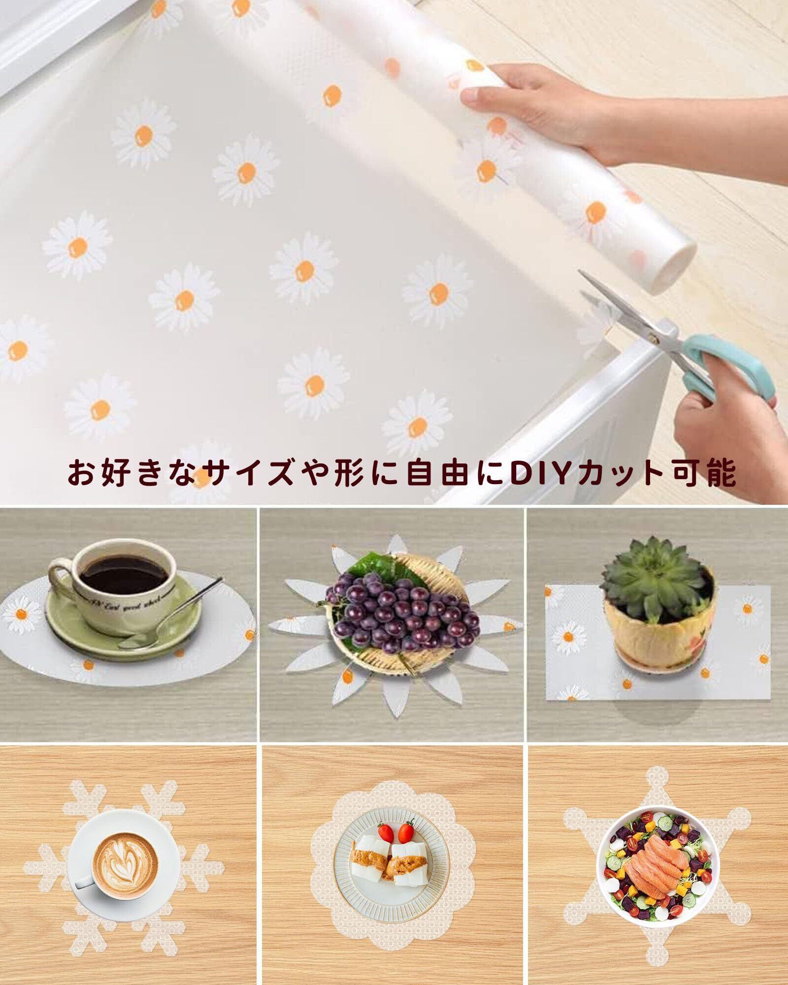 「この『Alip食器だな シート』で、あなたの大切な収納スペースを守りましょう!」/特徴:幅30cm×長さ300cmの大判サイズで、キッチンや靴箱、棚など多様なスペースにぴったりフィットします。透明なデザインに可愛らしいデイジー柄プリントが施され、見た目にも楽しい印象を与えます。