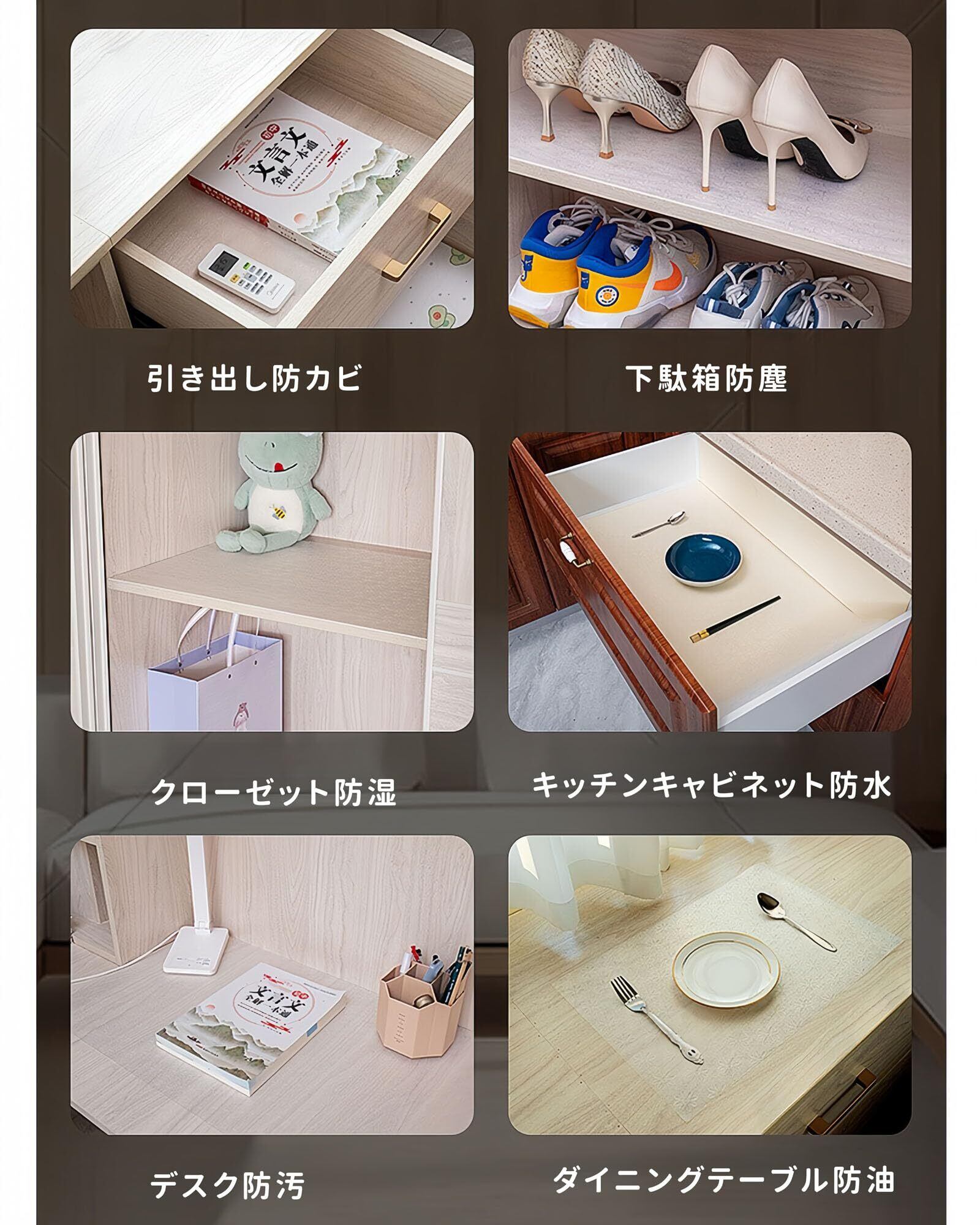 汚れ防止や防湿・防油機能を兼ね備えており、食器棚やキッチンでの使用はもちろん、靴箱やクローゼットでも活躍します。防虫機能もあり、大切なアイテムをしっかり守ります。