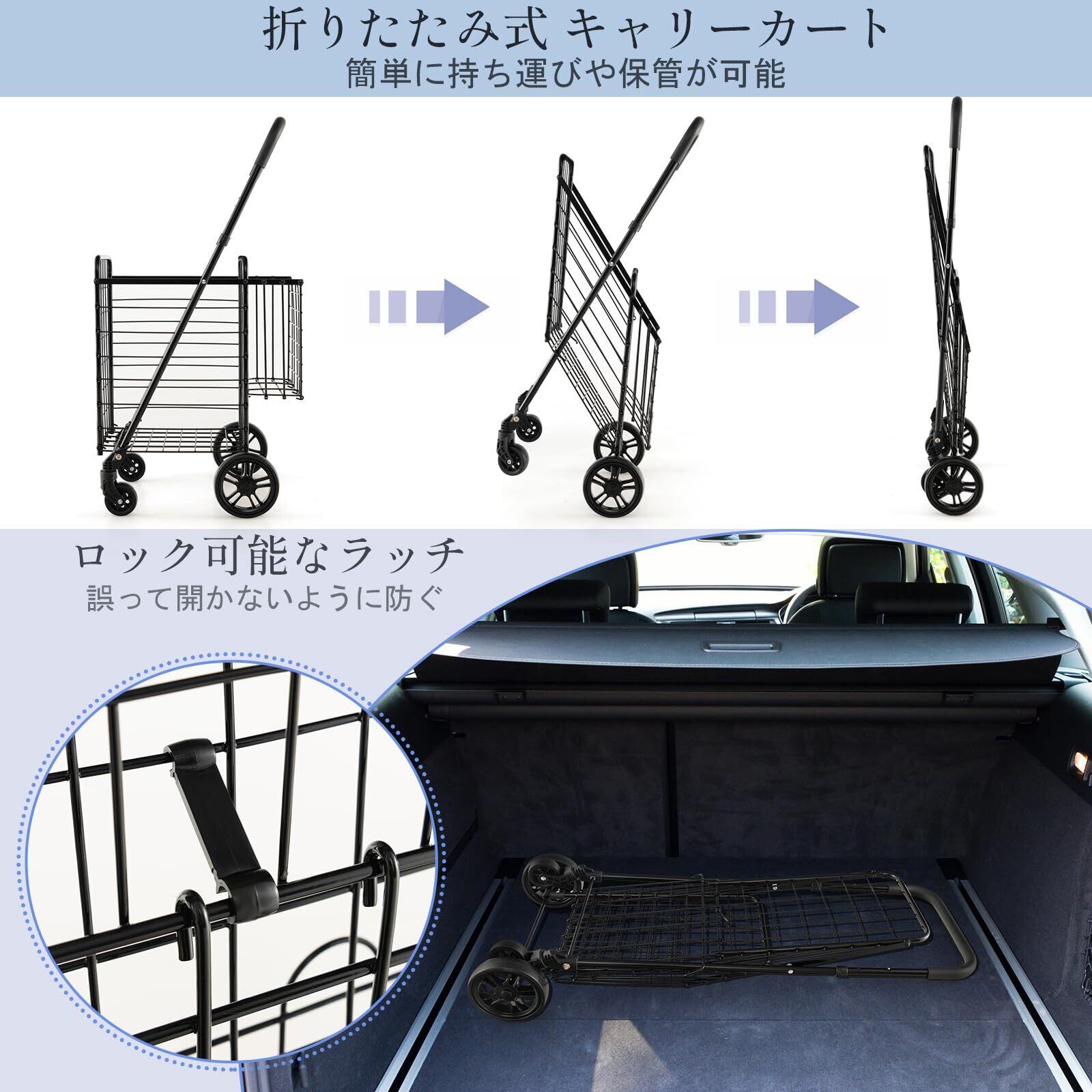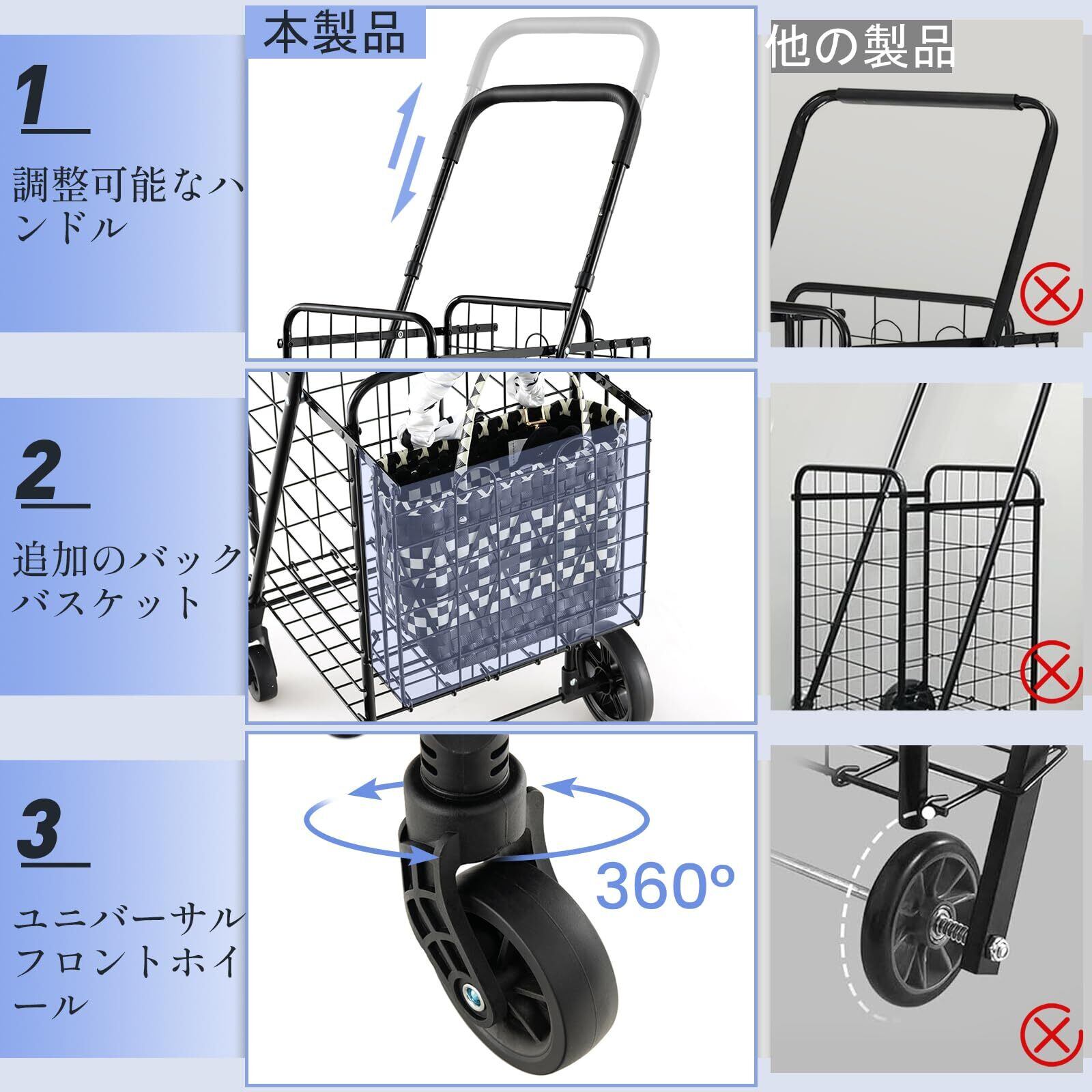 頑丈な設計により、日常の買い物や重い荷物の運搬にも安心してご使用いただけます。4輪車からのスムーズな移動が可能で、快適さを追求したデザインです。