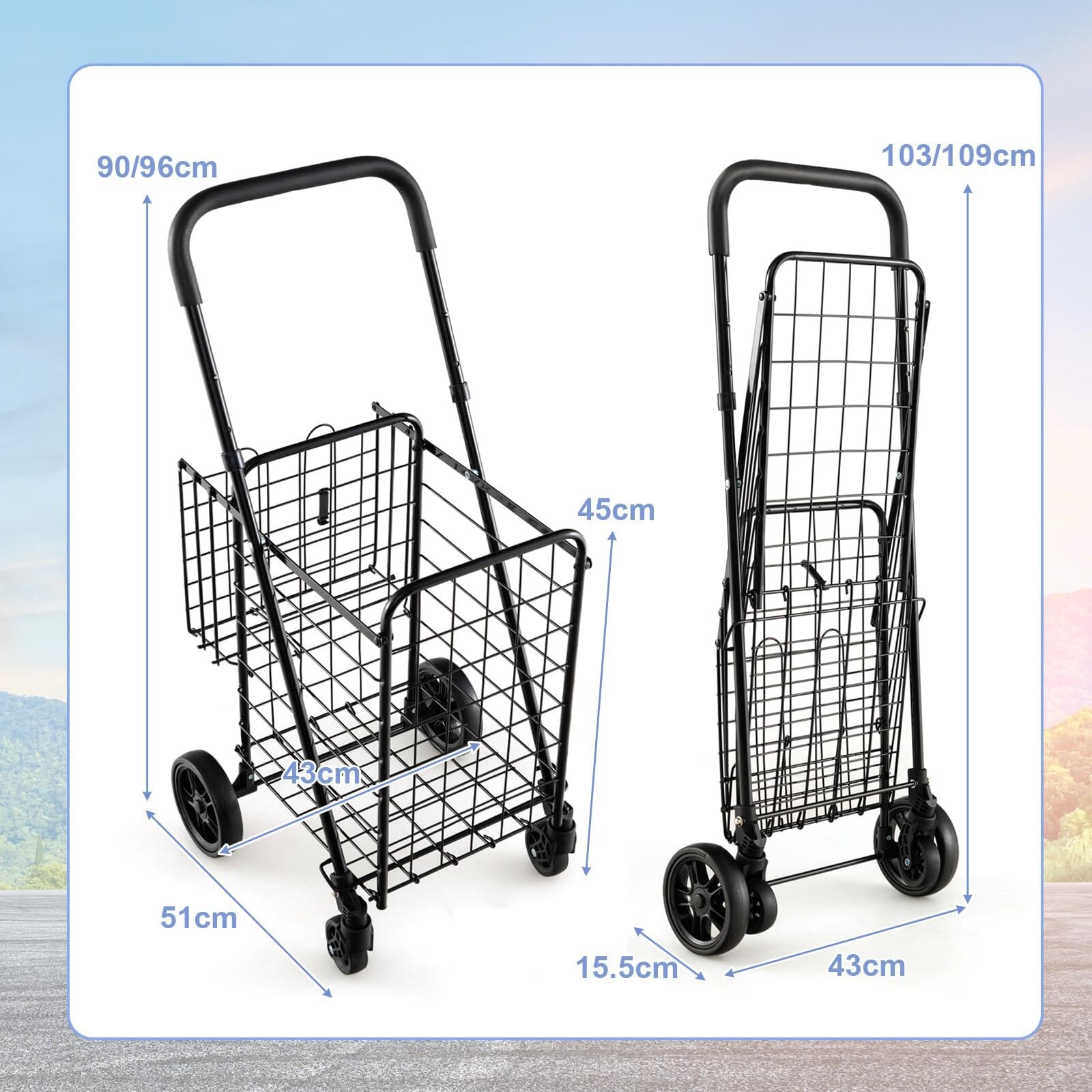 「この『GIANTEX ショッピングカート』で、あなたの買い物をもっと快適にしてみませんか!」/特徴:耐荷重20kgを誇るこのショッピングカートは、折りたたみ式でコンパクトに収納が可能。買い物からアウトドアまで、多様なシーンで活躍する便利なアイテムです。