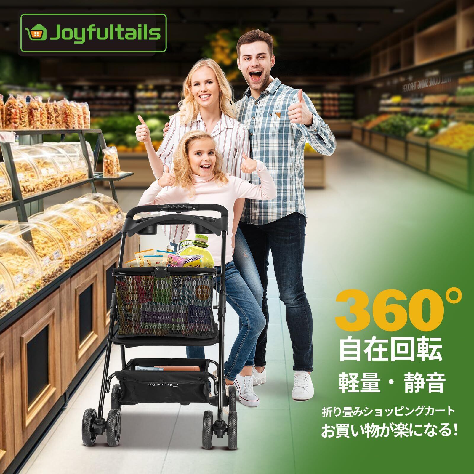 「この『Joyfultails ショッピングカート』で、あなたの買い物をもっと便利にしてみませんか!」/特徴:2段の設計で大容量を実現したこのショッピングカートは、ワンタッチで折りたたみ可能。静音設計と軽量素材を使用しているため、ストレスなくお買い物が楽しめます。