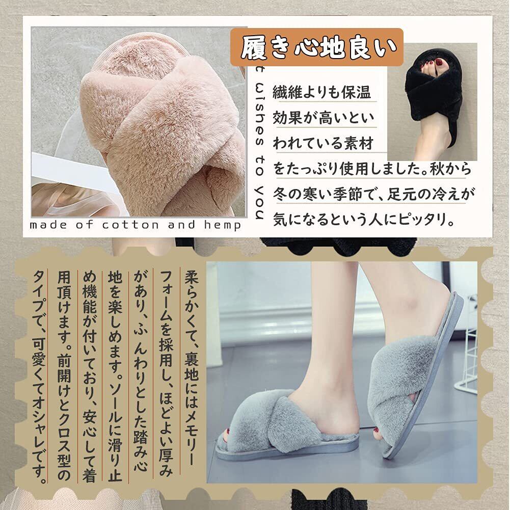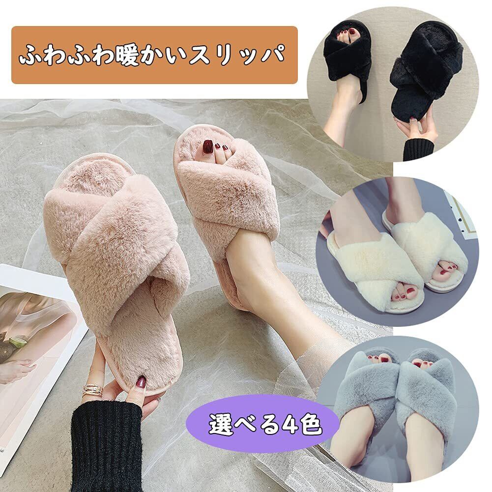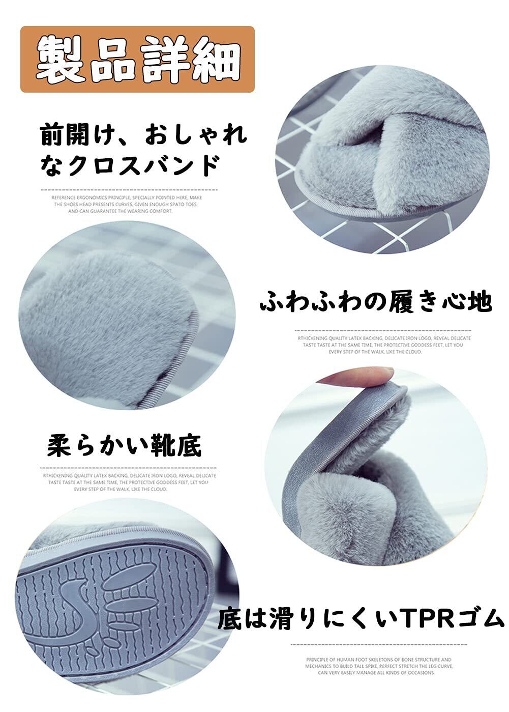 【製品仕様】グレー、ピンク、ブラック、ホワイト、4色3サイズを展開しており、おしゃれなデザインのクロス仕様、好みに合わせてご自分にピッタリな一足を選んで頂けます。ボリュームのあるふわふわのフェイクファーが360度どこから見てもおしゃれで可愛い。シンプルカラーなので毎日のコーデに合わせやすく、気軽に履けちゃう万能のサンダルです。恋人や家族とのお揃いスリッパとしてもおすすめです。
