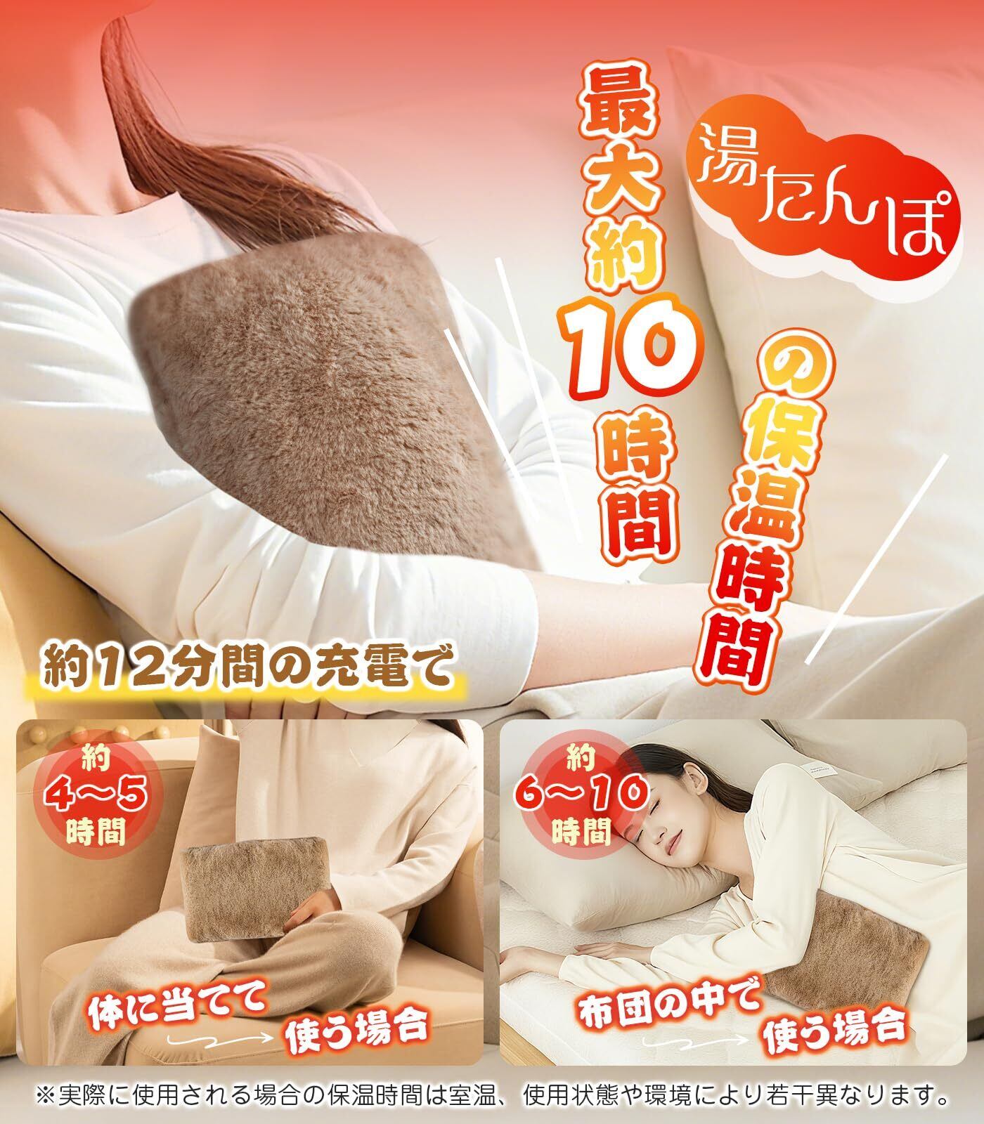 【12分間急速充電 4~10H長時間保温】コンセントにつないで約12分蓄熱するだけで、4~10時間に保温が可能です。布団の中では約10時間、お腹や腰に当てて使う場合でも約4~5時間は、じんわりと心地良い暖かさが持続します。(※具体的な保温時間は使用環境によって変わることがあります。)手足の冷えでお悩みの方、お腹の冷えが気になる方、暖房の乾燥が苦手な方に特におすすめです。