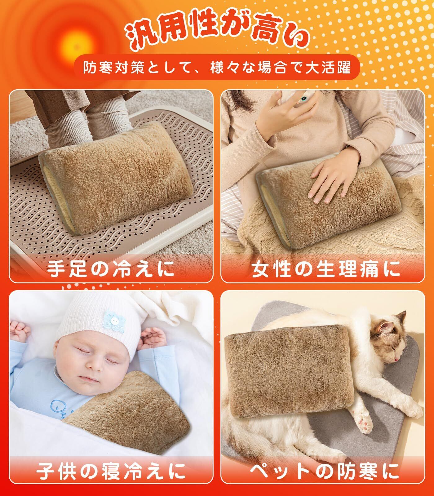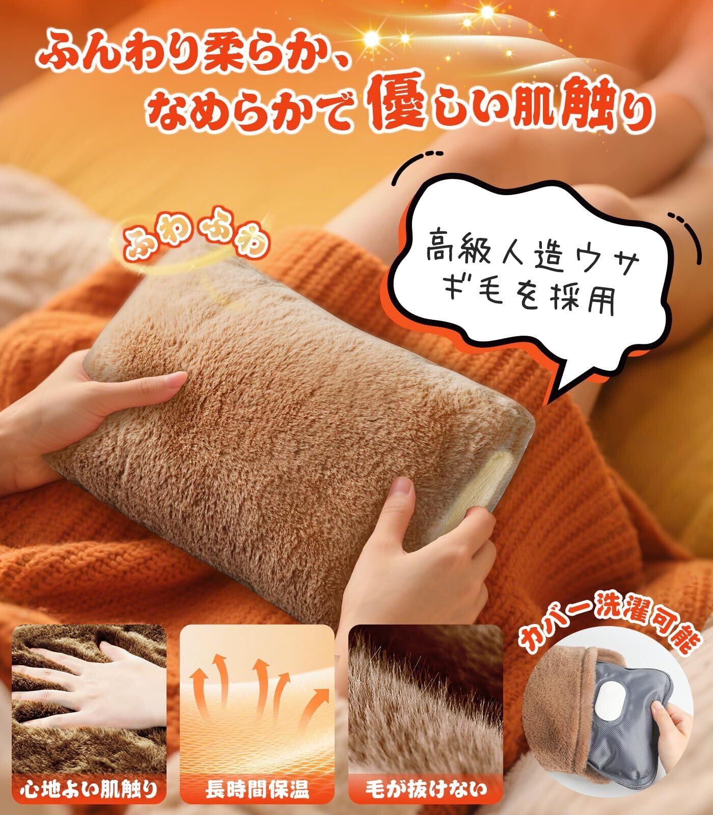ふわふわの柔らかい保温カバーが心地よさを提供します。体が冷えやすい指先や足元、背中、お腹まわりをしっかりと温めてくれるので、リラックスしたい夜や冷え込む日に最適です。この湯たんぽで、ほっこりとした暖かさをお楽しみください!