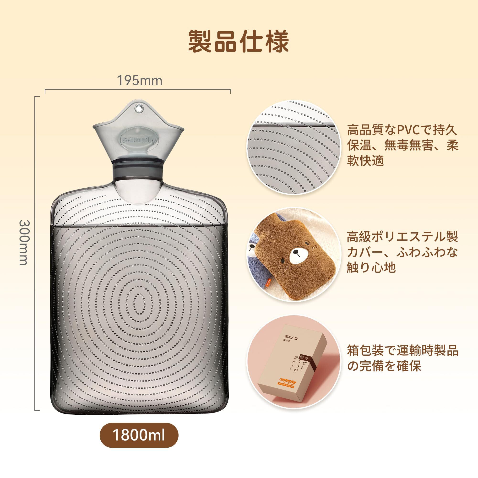 samply 湯たんぽ ゆたんぽ お湯 注水式 容量1.8L かわいい カバー付き エコ 省エネ 防寒グッズ 冷え対策 ギフト (クマ ブラウン 1.8L)