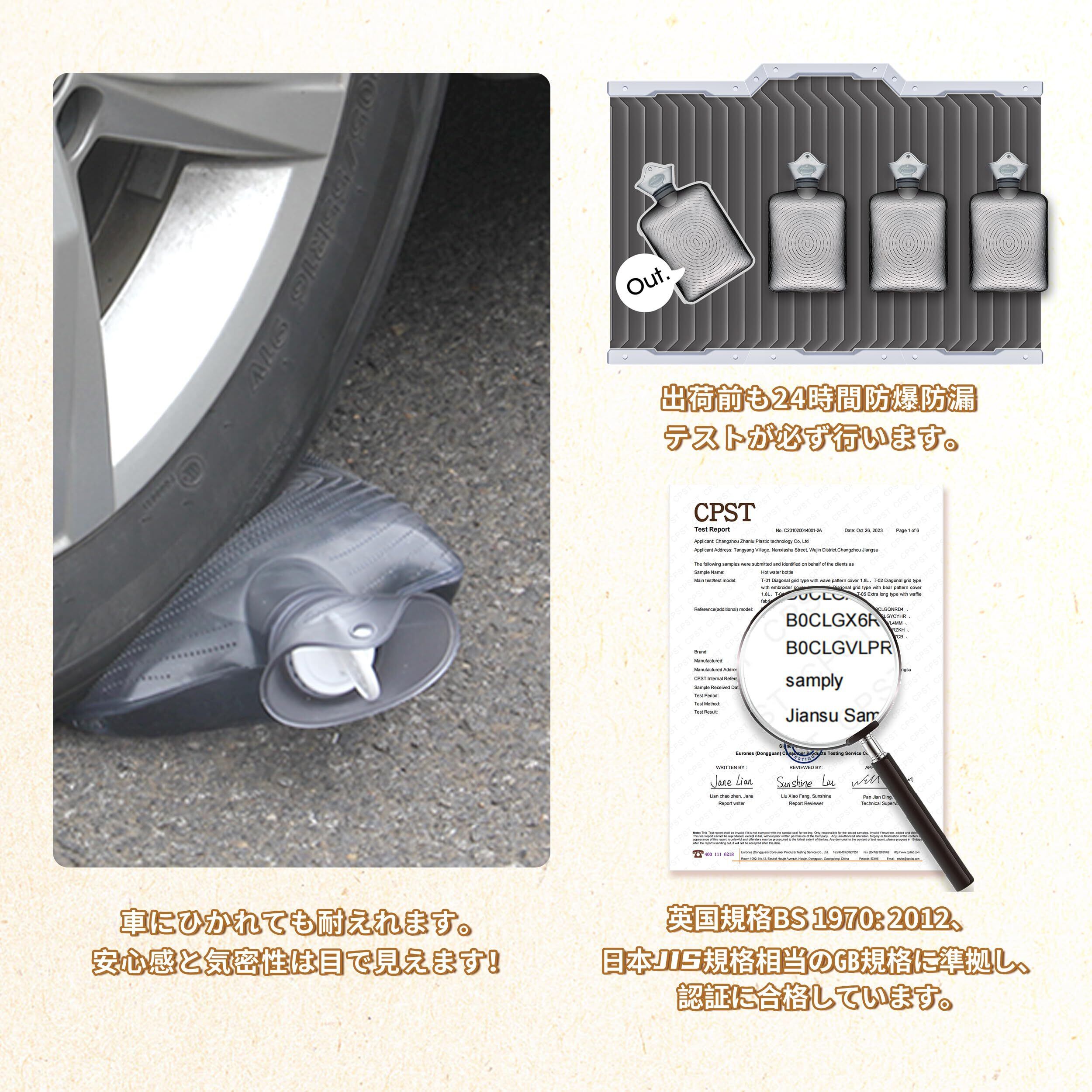 「5年間超長期安心サポート」samplyの湯たんぽは英国規格BS 1970:2012に準拠し、日本JIS相当のGB規格にも合格。出荷前には24時間の防爆・防漏テストを実施済みで、耐荷重500kg以上をクリア。5年間の長期付きで、万一初期不良やご不明点がある場合は、購入履歴からお気軽にお問い合わせください。