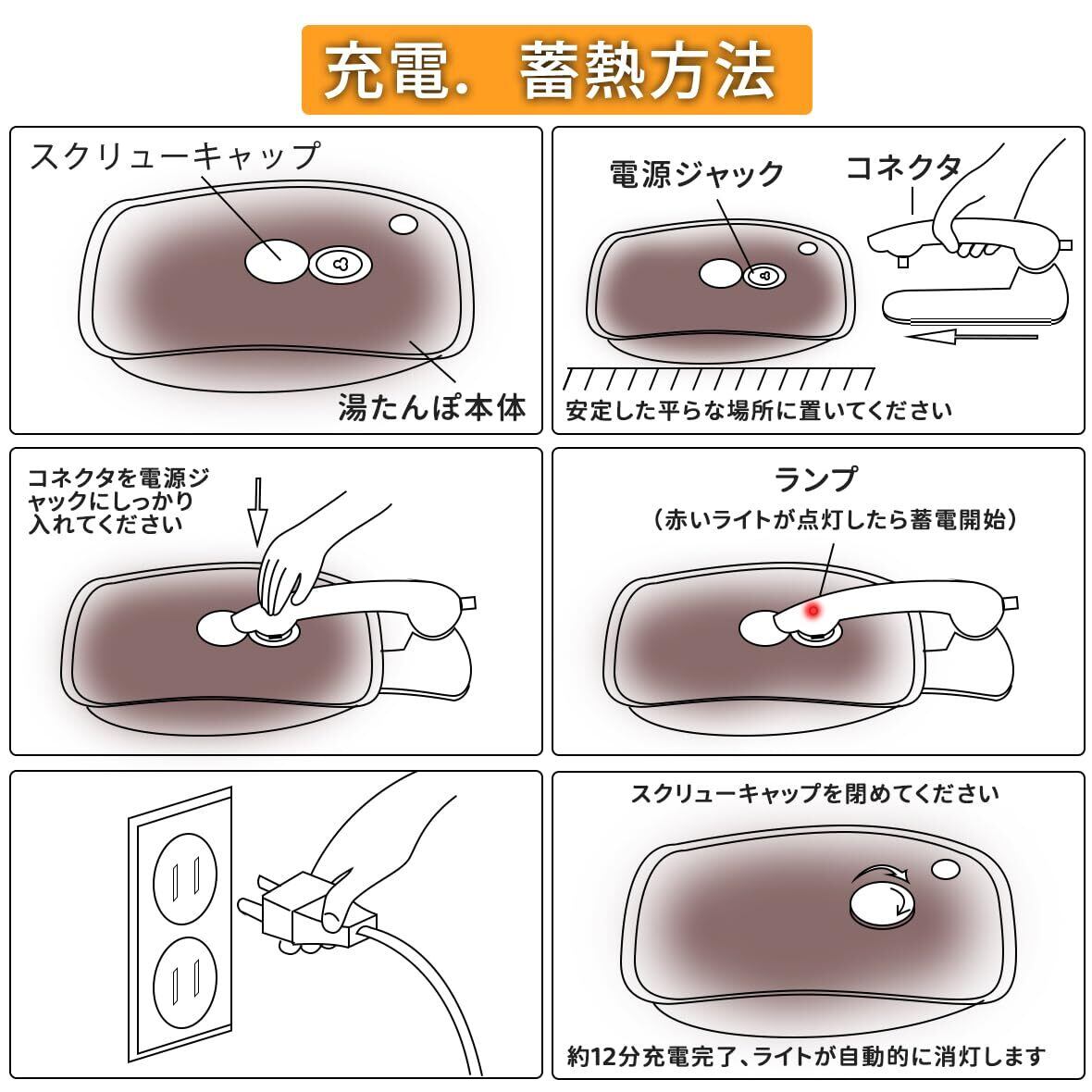【スピード充電】充電時間は10分程度で完了します。充電が完了した際には自動的にオフになりますので便利です。連続使用時間は6〜8時間で、夜間の就寝時も暖かく快適にして眠りにつく事が出来る蓄熱式湯たんぽです。