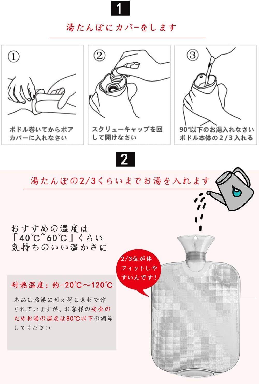 ➤【電気不要で繰り返し使えるふわもこ湯たんぽ】お湯を入れ替えれば繰り返し使えるのでとてもエコです。ボトルにお湯お入れるだけで、簡単にくり返し使えます。電気も使わず、自然な温もりが体に負担をかけず、ゆっくり、じんわりと身体を温めてくれます。 柔らかいPVC素材、高保温性、耐劣化性、安全です。 サイズ/容量:31cm×20cm/容量2L。
