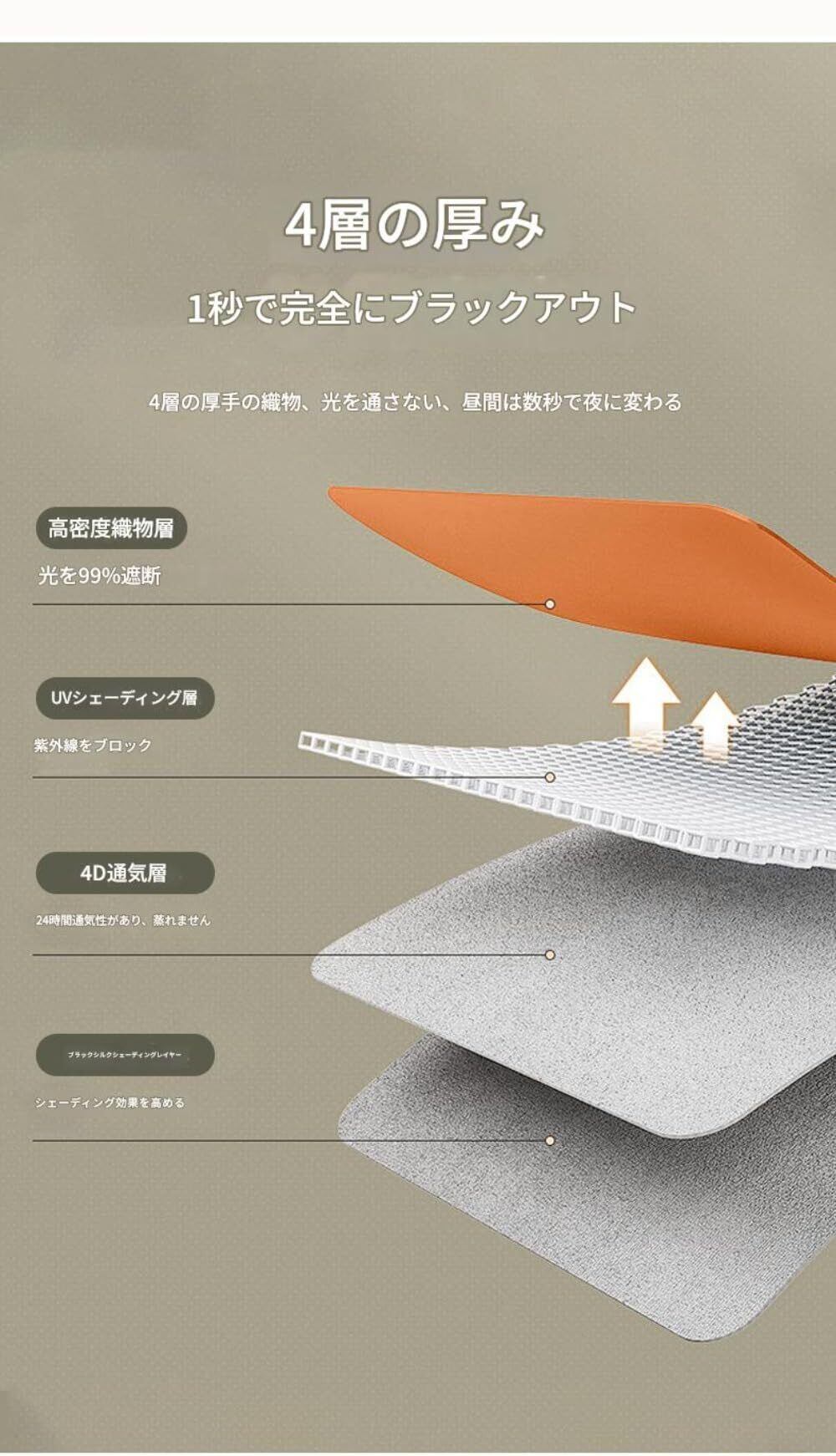 強力な遮光性能:特殊な素材を使用しており、外からの光をほぼ完全に遮断します。日中でも暗く、眠りやすい環境を作り出せます。プライバシーもしっかり保護され、個人的な空間を快適に過ごせます。