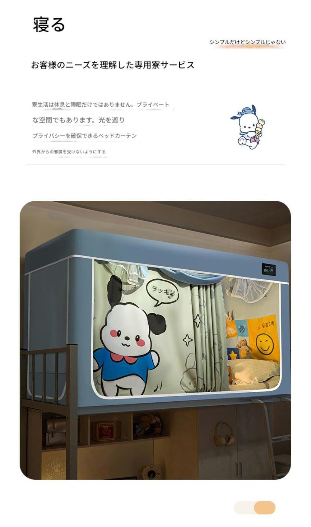 この全遮光寝室用蚊帳は、学生の生活に最適なアイテムです。遮光性と防蚊機能を兼ね備え、快適な睡眠環境を提供します。可愛らしいデザインで、学生の部屋を華やかに彩ります。