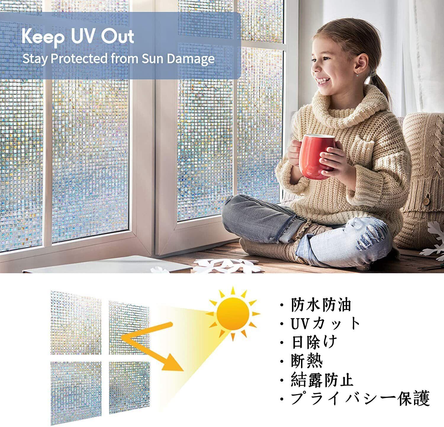 【日除け・プライバシー保護】窓用ガラスシールは一部の強烈な日光をよく遮り、紫外線を遮断し、日焼け止めと断熱ができ、太陽光で家具が老化するのを防ぐことができます。冬は暖かくお部屋の暖気を逃がしません(断熱效果)。半透明の状態は、のぞきを防ぎ、プライバシーを守ることができる上に、部屋を暗くすることもありません。採光に影響しません。