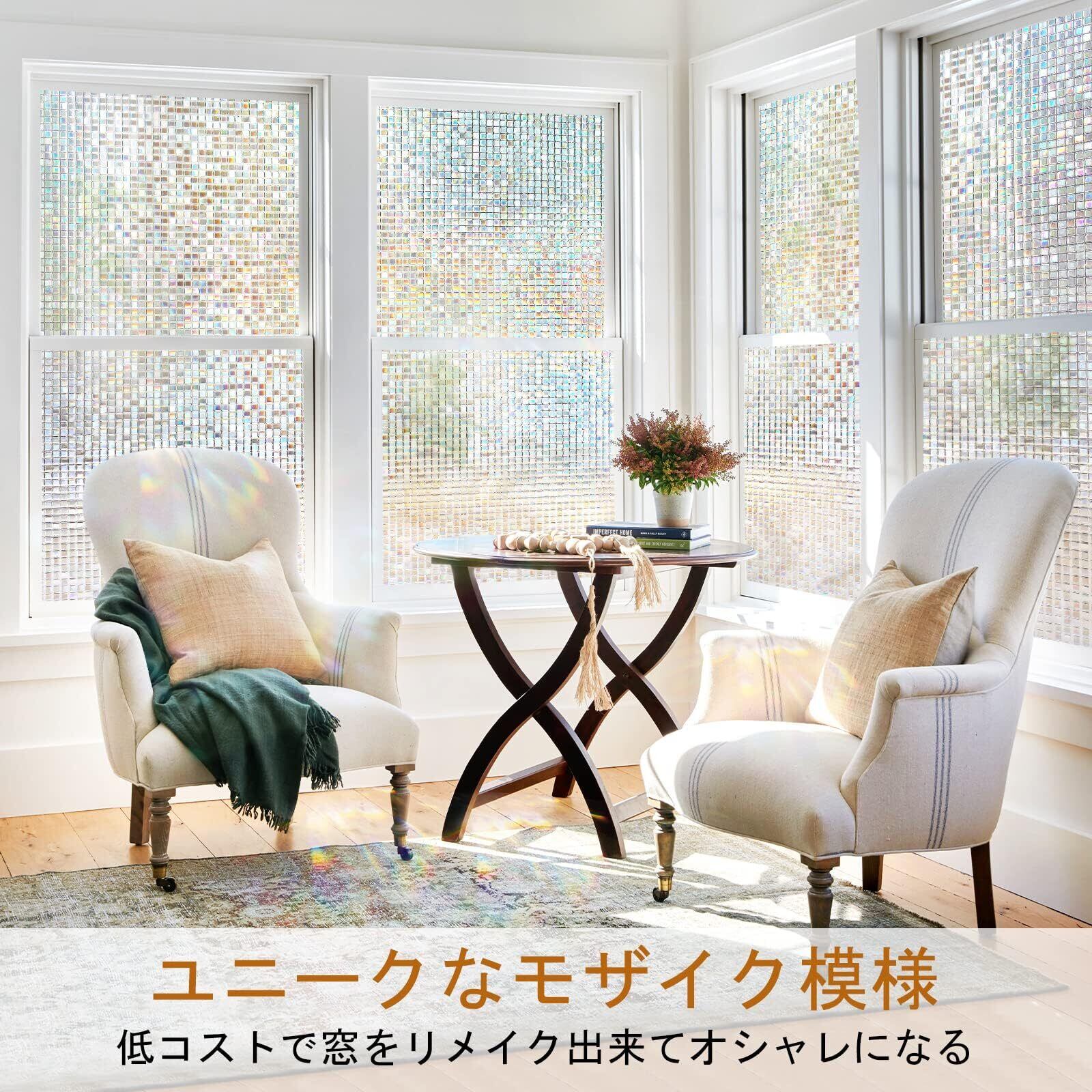 「この『Rabbitgoo 窓ガラス目隠しフィルム』で、プライバシーを守りながらおしゃれな空間を演出しましょう!」/特徴:幅90cm、長さ200cmのモザイクデザインが魅力的なこのフィルムは、目隠し効果や断熱機能など、快適な居住空間を実現します。水だけで貼れる超簡単施工で、賃貸物件にも最適です。