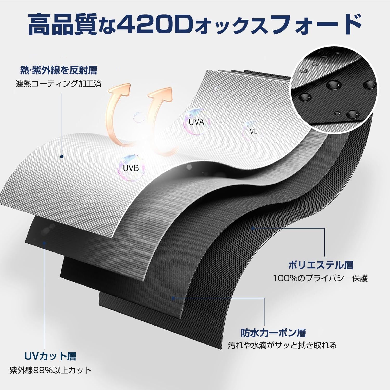 4層構造: 420Dオックスフォード素材に熱・紫外線反射層、防水カーボン層、UVカット層、ポリエステル層を組み合わせた高品質な遮光シート