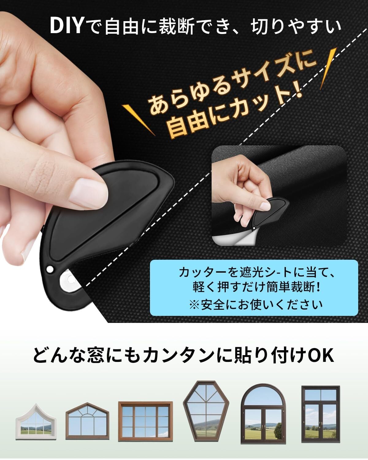 【様々なシーンで大活躍】防水機能を搭載しているので、自宅の窓やバスルームのドアなど、テープが貼れる場所なら自由にお使いいただけます。 フリーカット対応なので、どんなサイズにも簡単に合わせられます。完全キットを含む:遮光シート×1、丸透明両面テープ×1、マジックテープ×5セット、マーカー ×1、シート裁断用カッター×1、テープメジャー×1、収納袋×1、取扱説明書×1 。