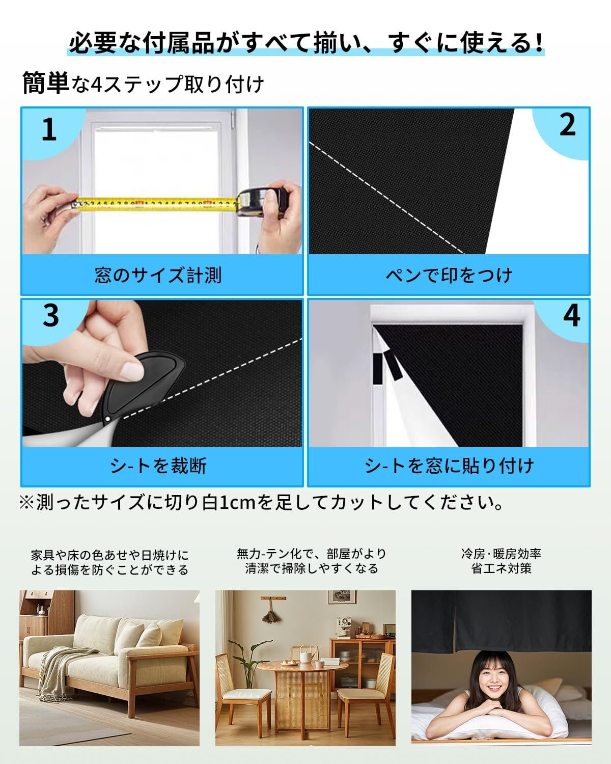 【uvカット・紫外線防止】紫外線99%以上カット対応!遮光シートを使用することで、有害な紫外線からお肌を守り、家具の褪色・劣化も防ぎます。さらに地震や台風時にガラスが割れても、破片の飛散を抑え怪我を防ぐ効果も期待できます。強い日差しを完全遮断!夏は涼しく、冬は暖かい快適な室内環境を作り出し、エアコン・暖房のエネルギーコスト節約にも貢献します。