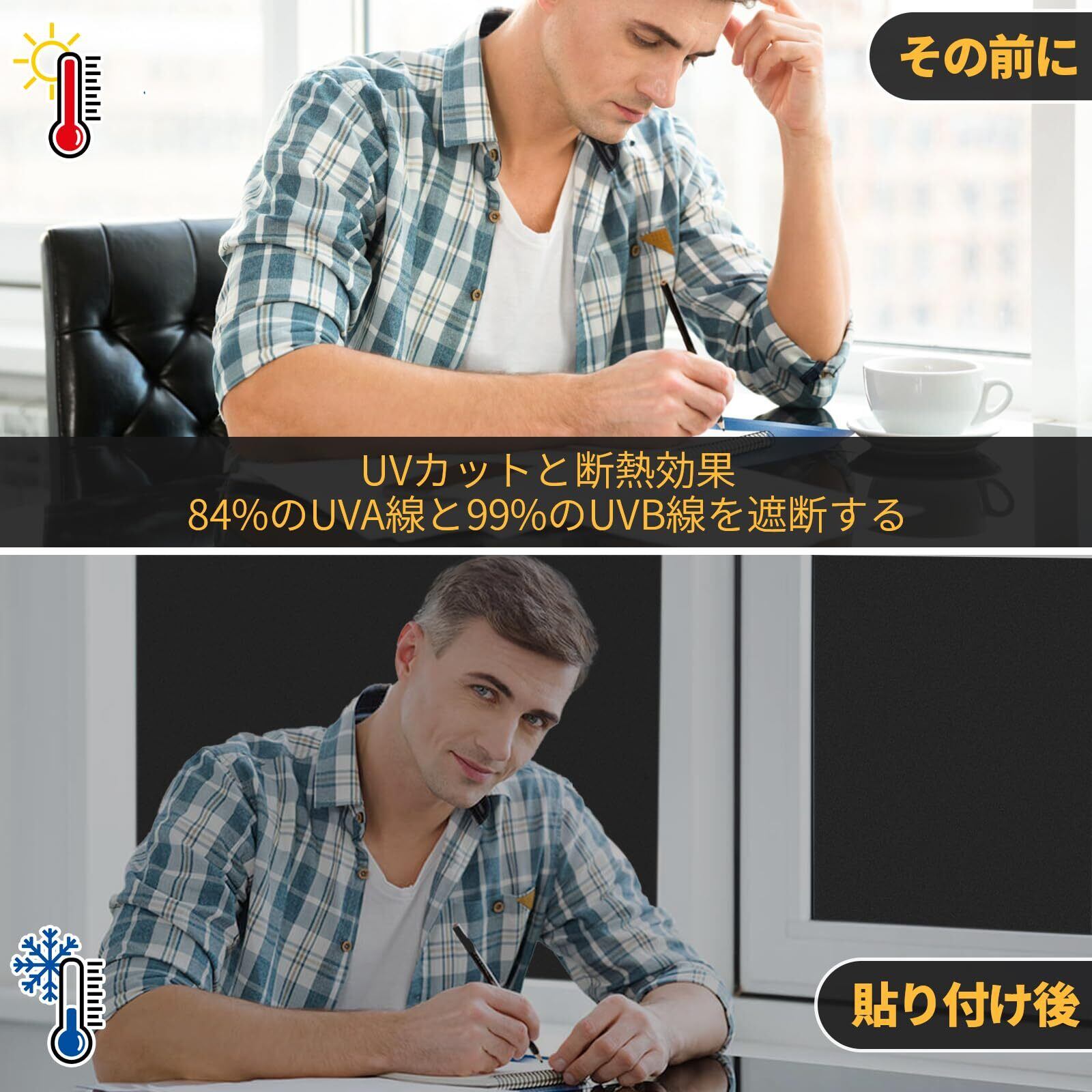 真っ黒 超遮光 目隠し効果: 黒色のすりガラス調デザインで、可視光線透過率0%の完全遮光タイプ。不透明な素材で、赤ちゃんや昼夜逆転の方、光に敏感な方のお部屋に最適です。プライバシー保護にも優れており、カーテンを使わない「無カーテン化」で、お部屋をすっきり広く見せることができます。