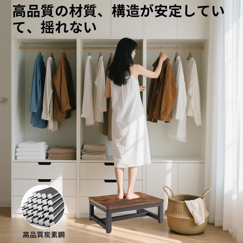 この踏み台は、頑丈なデザインながらも軽量で持ち運びが簡単。滑り止め加工が施されているため、安定した足元を提供し、高い場所に届きやすくなっています。家庭内のさまざまな用途に最適で、小さなお子様の使用時にも特におすすめです。