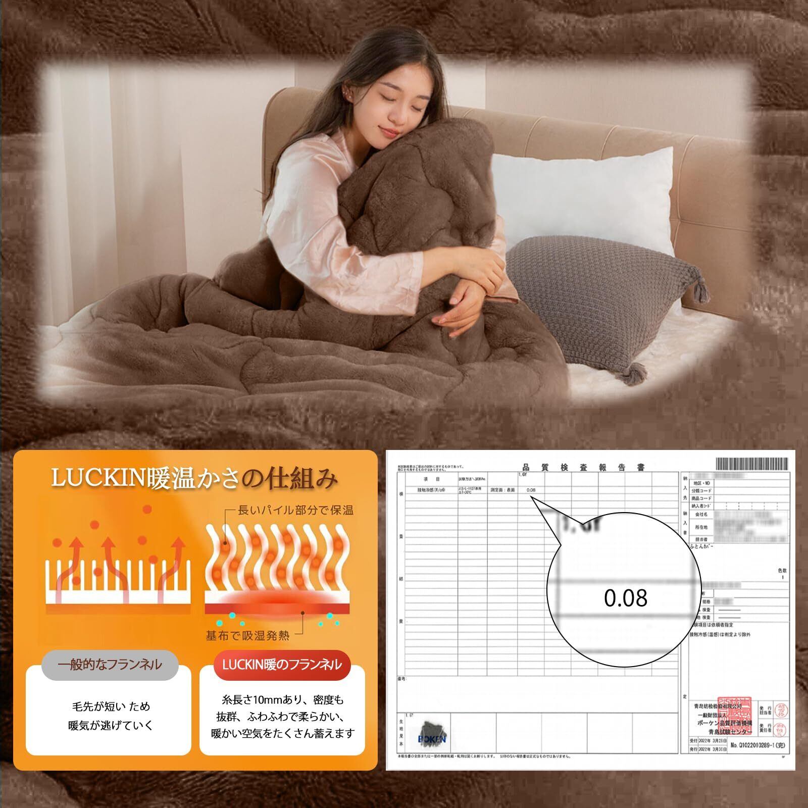 【接触温感 Q-MAX 0.08】 Q―maxとは人の皮膚からものへの熱の移動を数値化したものです、値が小さい程暖かく感じます。掛け布団の側生地は、糸長さ10mmあり、密度も抜群、ふわふわで柔らかい、暖かい空気をたくさん蓄えます。接触瞬間にあったか、ぬくぬく感じます。『LUCKIN暖』のネームを付けている面は本製品の表です。