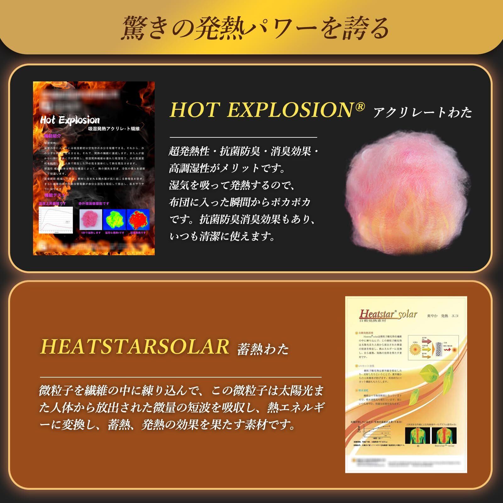 【超発熱性・抗菌防臭・消臭効果・高調湿性】この掛け布団は『Hot explosionアクリレートわた』合成繊維を使用して、吸湿発熱して身体をあたためるんで、ムレ感のないドライなあたたかさが魅力です。
