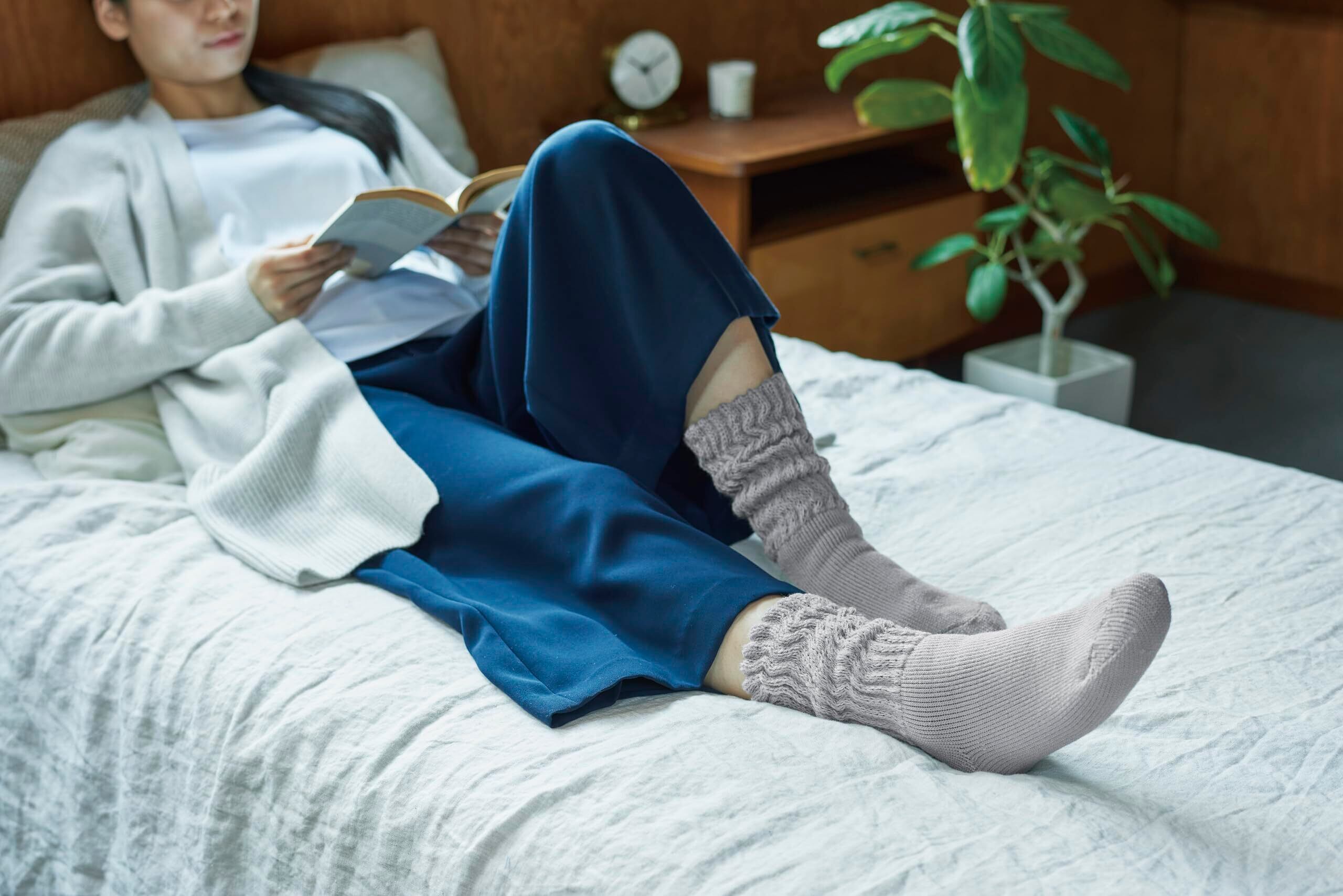 ミドル丈のデザインは、足首までしっかりサポートしながらも、締め付け感のない快適な履き心地を実現。普段使いはもちろん、寝る前のくつろぎタイムや、朝の支度時にも大活躍します。