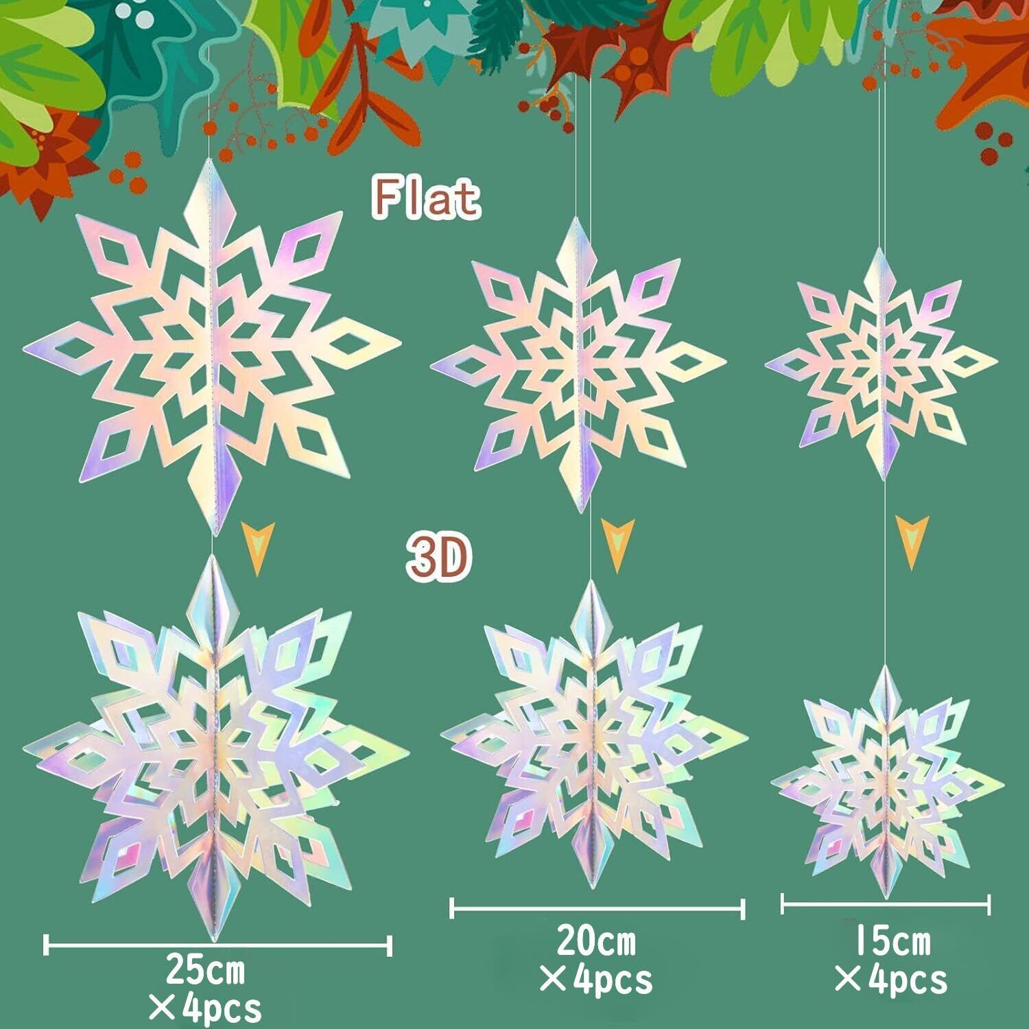 「この『クリスマス飾り付けセット』で、幻想的なクリスマスの雰囲気を演出しましょう!」/特徴:美しい虹色のスノーフレークオーナメントが12点セットになっており、あなたのクリスマスデコレーションを華やかに彩ります。立体的なデザインで、見る人を魅了します。パーティーやご自宅のインテリアとして最適です。