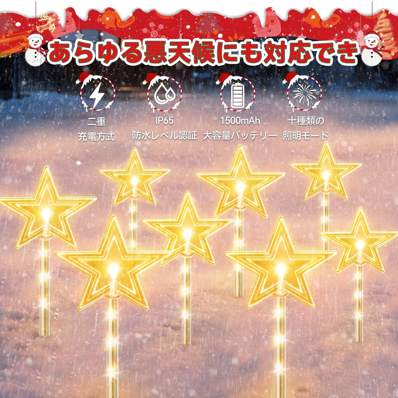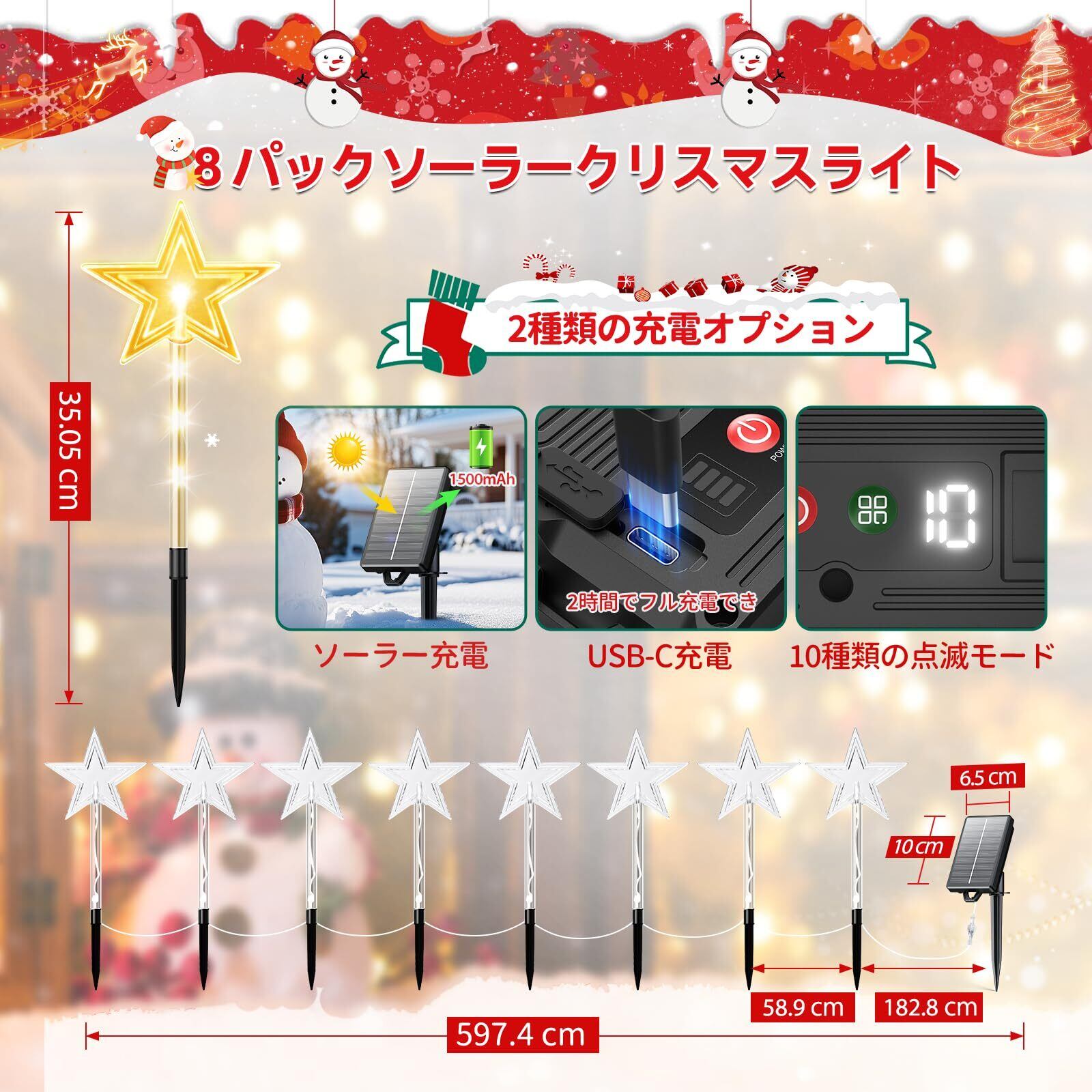 Letmy クリスマス 飾り ソーラーライト 屋外 防水 8つの輝かしい星 埋め込み 電飾 ソーラー充電/USB-C充電ともでき イルミネーション ガーデンライト 屋外 ソーラー 十種類の照明モード IP65防水 高輝度 暖色LED led クリスマス ロマンチック christmas/パーティー/誕生日/結婚式など適用 照明 christmas lights 8個セット