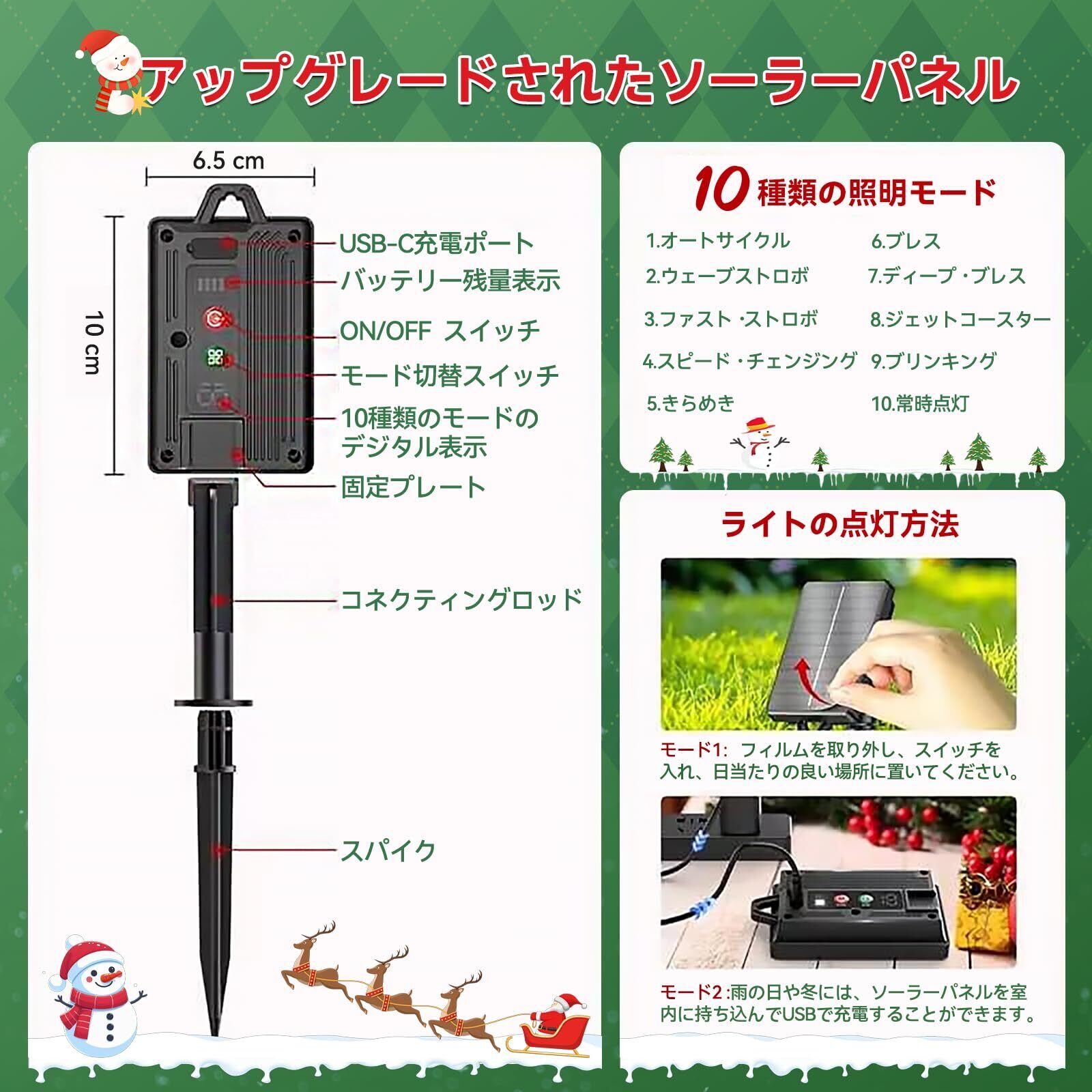【10種類充電モード&1500mAh大容量バッテリー】イルミネーションライトのソーラーパネルは高品質単結晶シリコンを使用し、多結晶シリコンよりも30%以上の変換効率を実現。10種類の照明切り替えボタンを内蔵し、明るさセンサー付きの1500mAh大容量バッテリーは、6-8時間の太陽光充電または2-3時間のUSB充電で12時間以上点灯可能。クリスマスのアウトドア照明の最適な選択です。