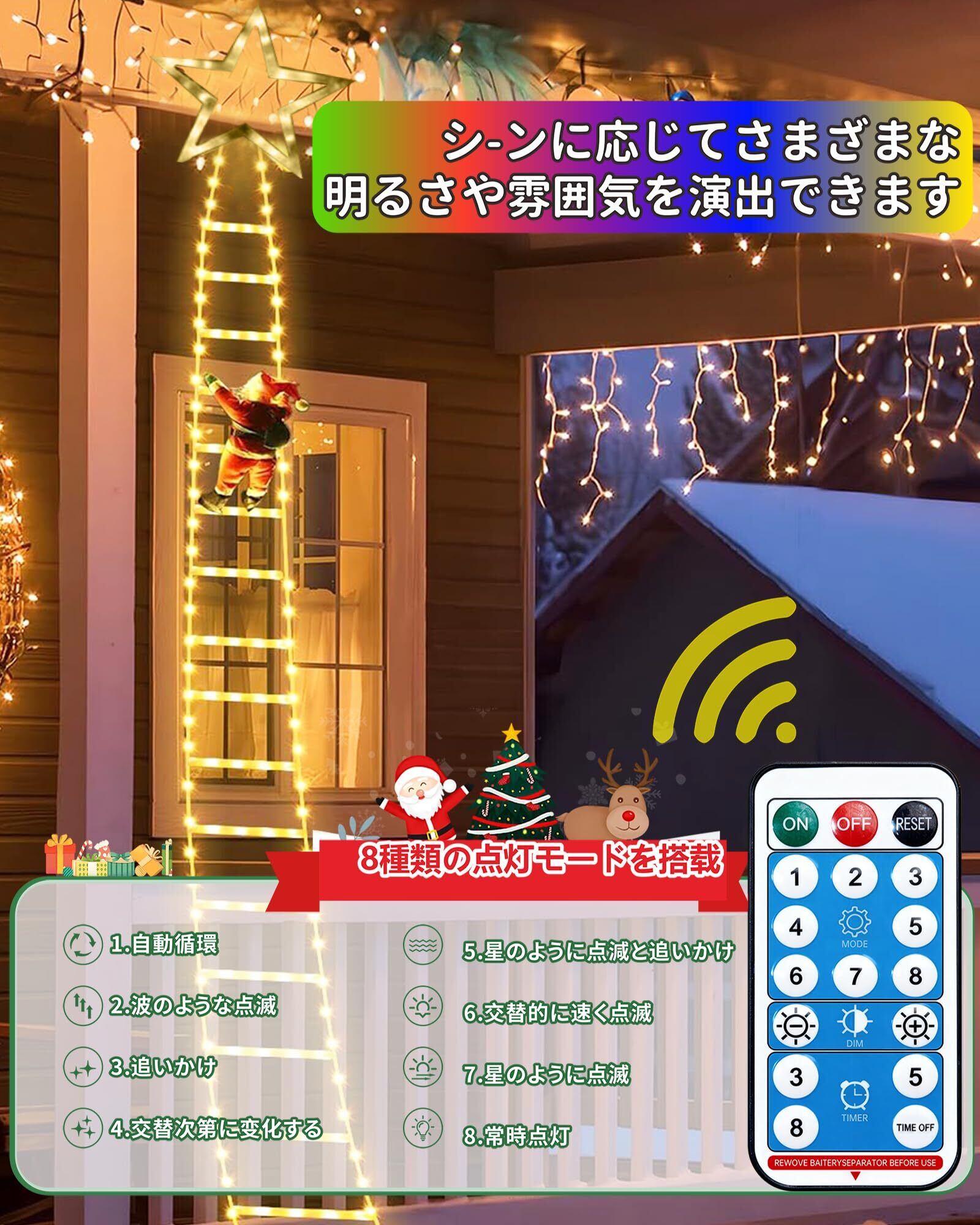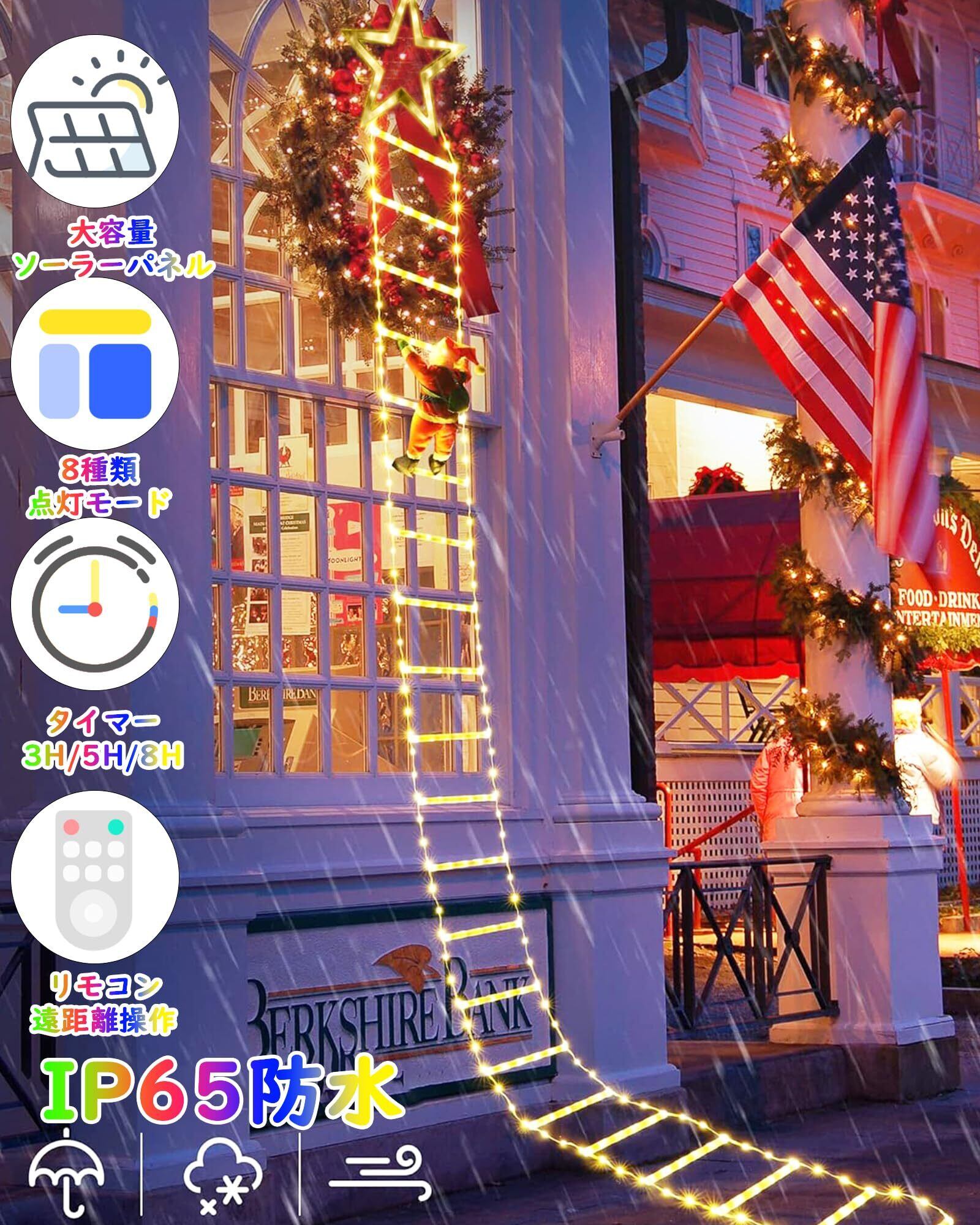 クリスマス イルミネーションライト ソーラーストリングライト ledイルミネーションライト 8種類の点灯モード 屋外 防水 ソーラー&USB充電可能 梯子 サンタクロース 266球 3M 自動点灯 消灯 3H/5H/8Hタイマー機能 リモコン付 クリスマス 飾りライト 学園祭 屋外 室内 庭対応 (ウォームホワイト)