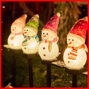 「この『クリスマス ソーラーライト 雪だるま』で、楽しいクリスマスの雰囲気を演出しましょう!」/特徴:かわいらしい雪だるまのデザインが特長のソーラーライト4点セット。屋外に飾るだけで、クリスマスの魔法を感じさせる特別な空間を作り出します。埋め込み式のデザインにより、庭やアプローチをおしゃれに飾ることができます。