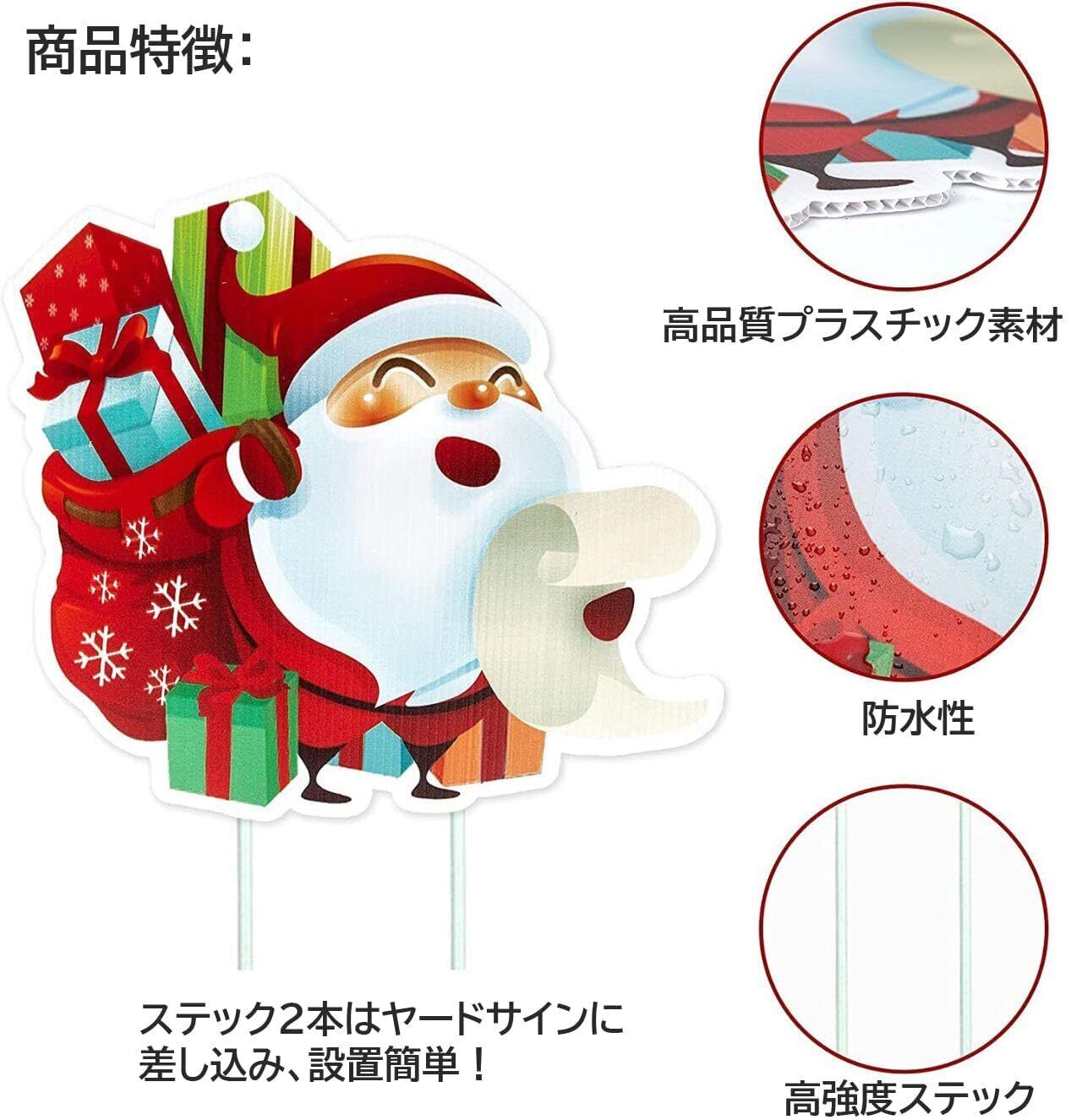 【商品仕様】内容:クリスマス ヤードサイン×8枚、ステーク×16本;素材:プラスチックダンボール;サイズ:それぞれ違うので、商品画像を参考してください。ヤードサインは劣化や色褪せの恐れがございますので、長時間屋外環境に置くことをおススメしません。