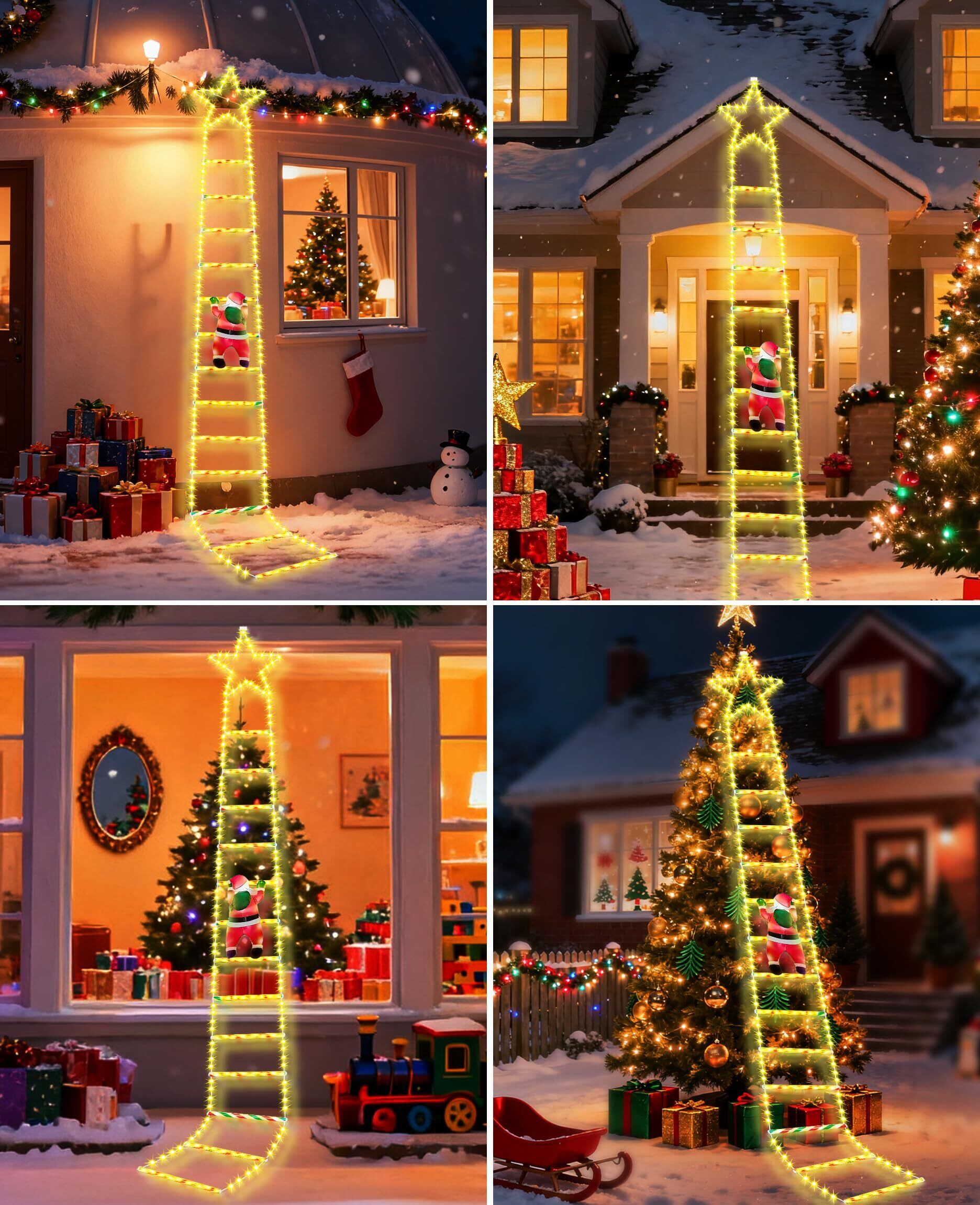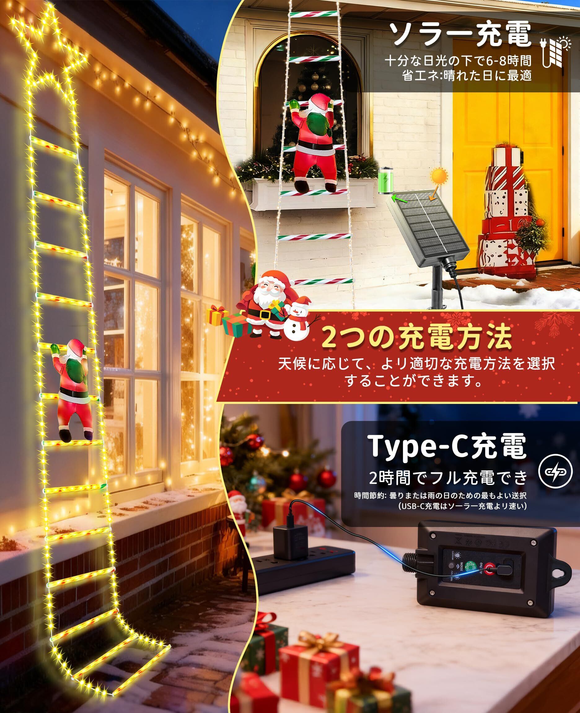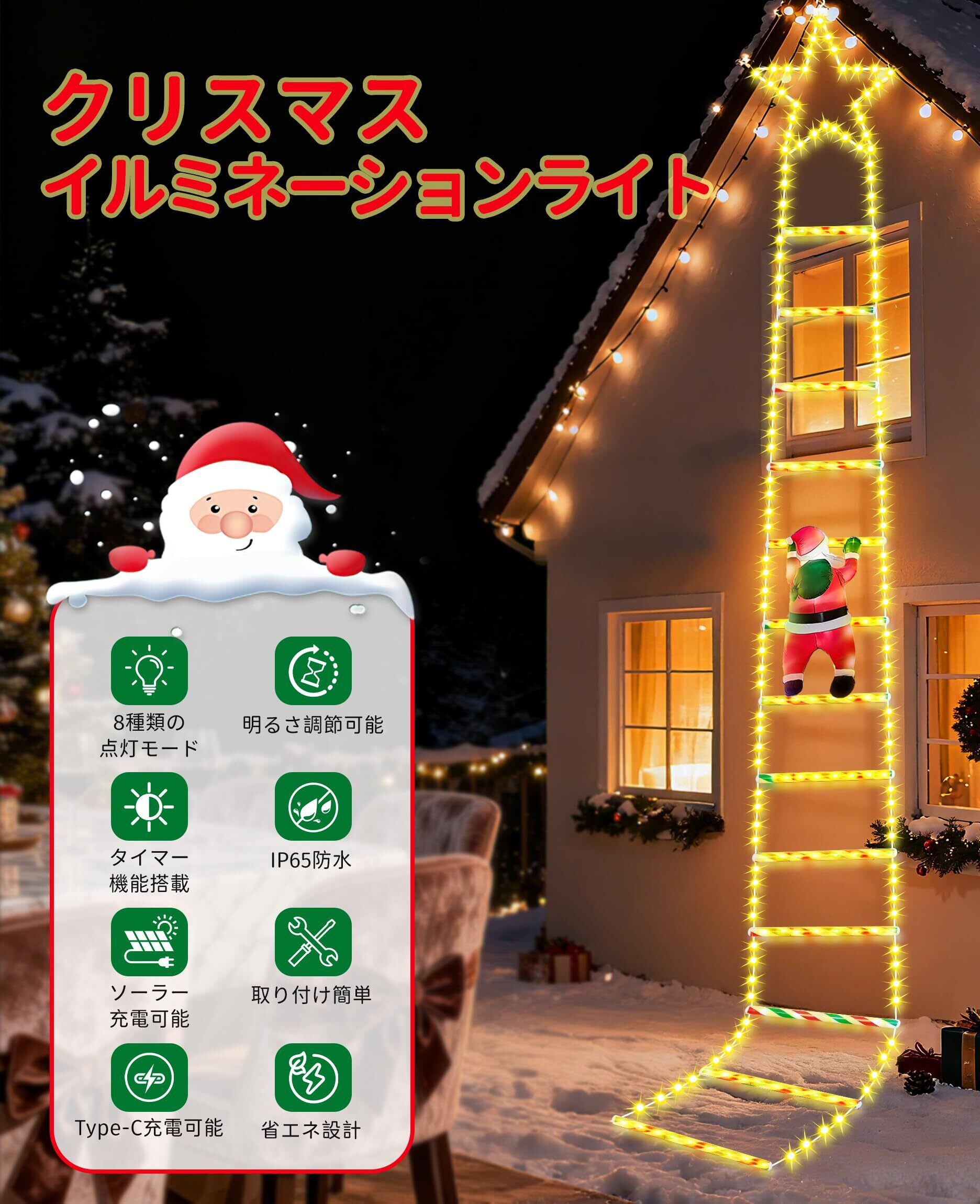 【2025最新】クリスマス イルミネーションライト 8種類の点灯モード ソーラーストリングライト 屋外 防水 ledイルミネーションライト ソーラー&USB充電可能 2つの充電方式 LED 梯子 サンタクロース 飾り ライト 266球 3M 自動点灯/消灯 3H/5H/8Hタイマー機能 リモコン付 クリスマス/学園祭屋外/室外/室内/庭対応 飾りライト (電球色)