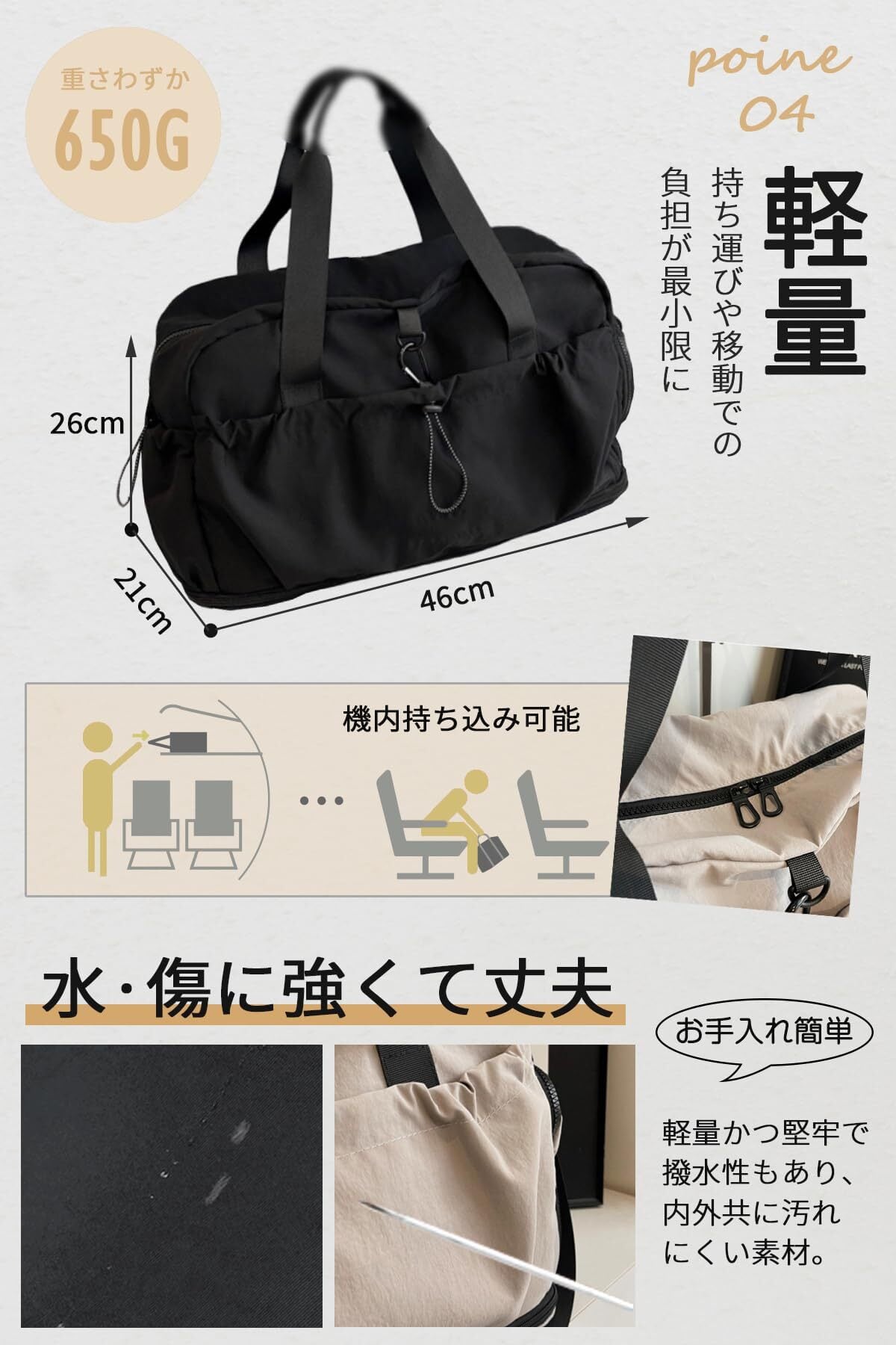 【軽量で機能的な素材】 軽量なナイロン生地を使用し、カバン内の荷物をしっかり守ります。内部には濡れたものを収納できる防水ポケットがあり、側面には靴を収納できるポケット、反対側には調節可能なサイドポケットを備えています。また、背面には行李箱に掛けられる機能があり、さらに便利なファスナーポケットも付いています。
