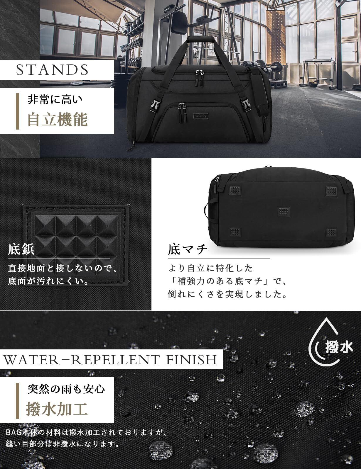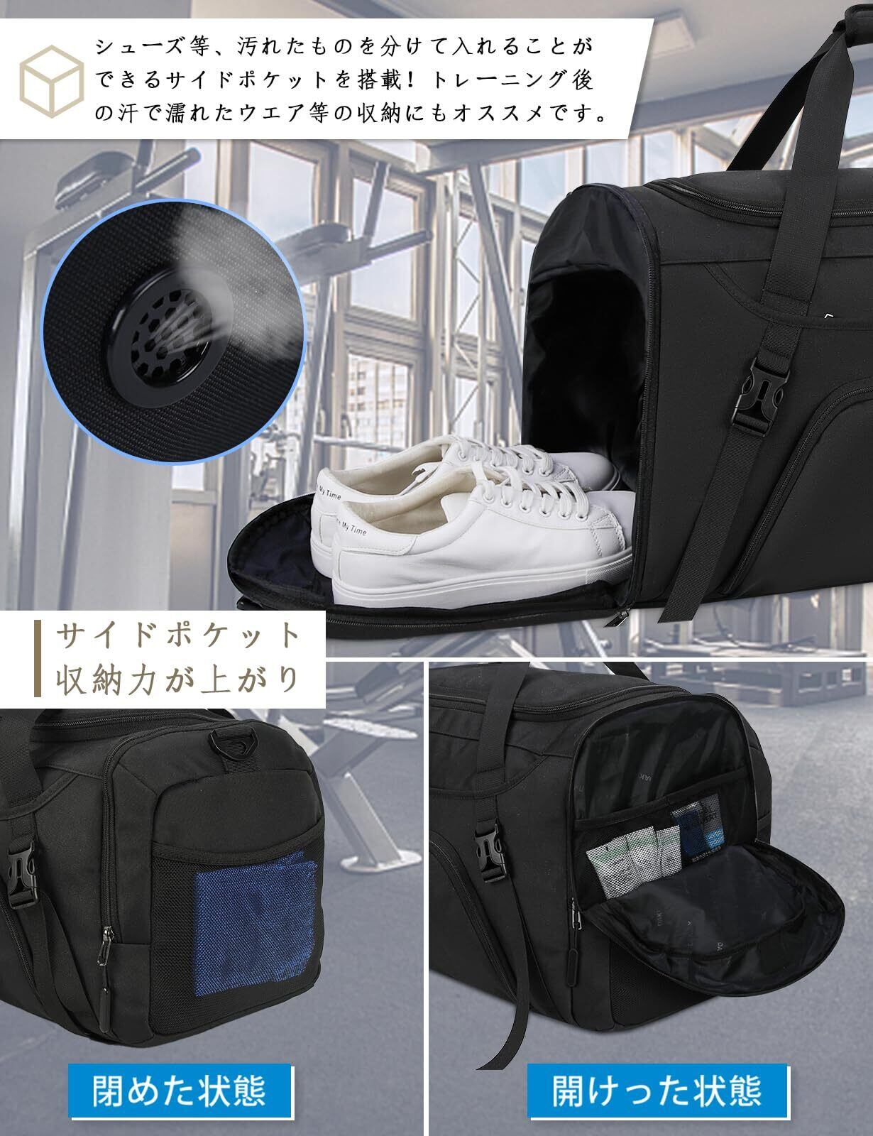 スポーツバッグ メンズ ボストンバッグ 大容量 修学旅行 旅行バッグ YKKファスナー 撥水加工 乾湿分離 ジムバッグ 40L 55L シューズ収納 斜めがけ 手提げ 肩掛け 男女兼用 black-55L