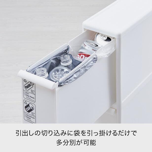引出し内に複数の袋が設置できるので、引き出しの前後で更に分別が可能。分別ゴミの多様化に対応。