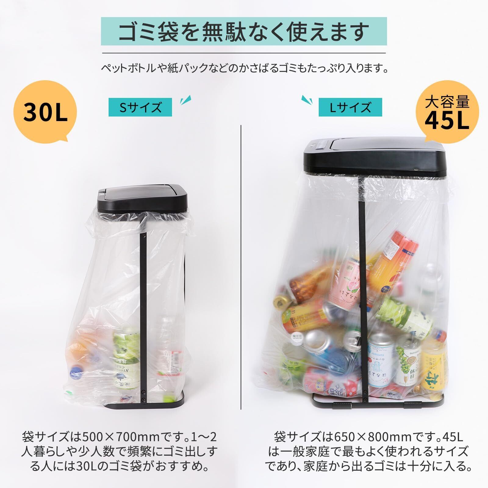 45Lの大容量にも関わらず、幅25.5cmと省スペース設計が施されています。リビング、キッチン、またはトイレなど、さまざまなシーンで活躍。大きなサイズのゴミ袋も楽に対応し、使いやすさが魅力です。